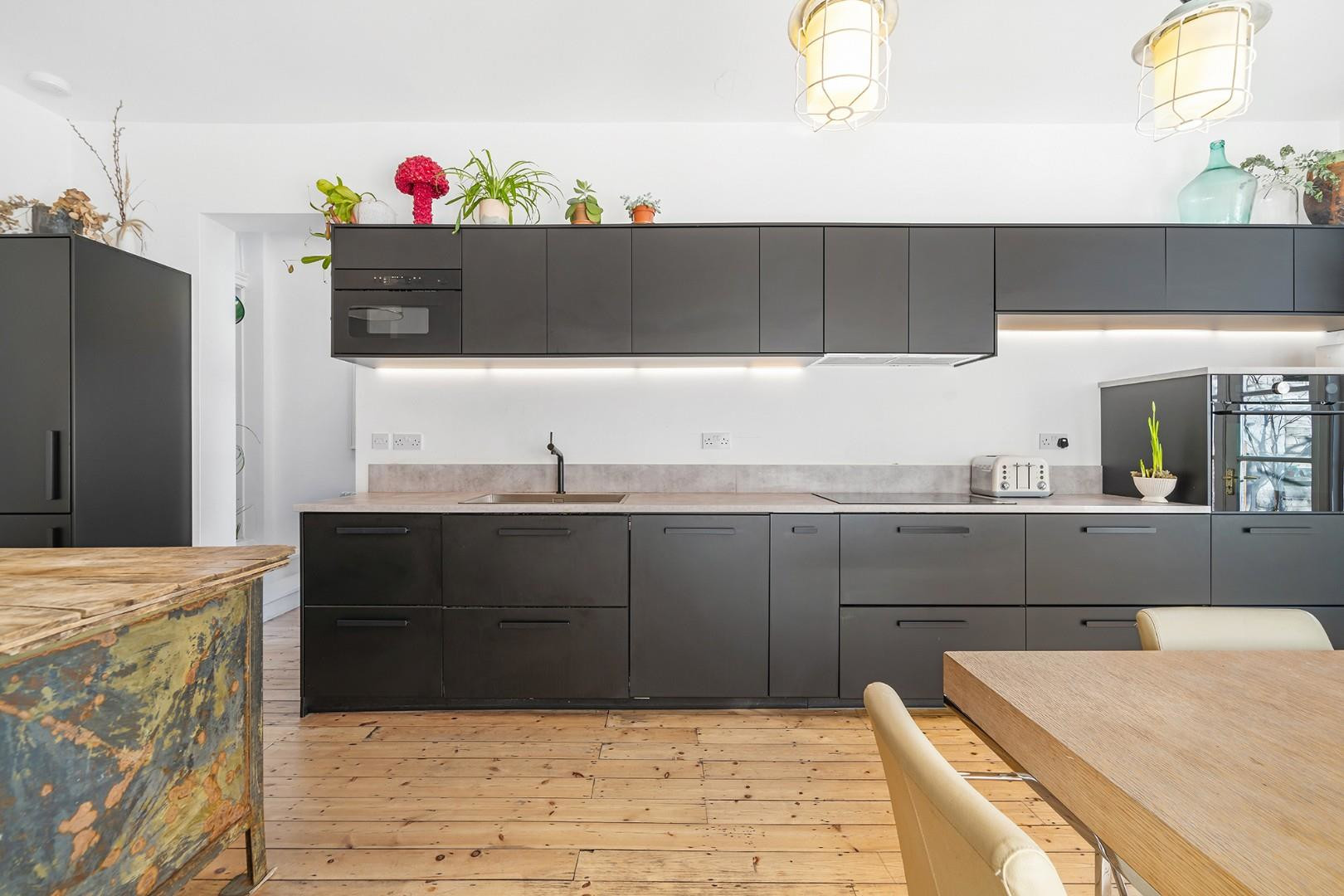 Arranged over the first floor are three well-proportioned double bedrooms. One being particularly impressive, spanning the entire width of the property and boasting the same attractive arched windows as downstairs. The further two bedrooms are nestled towards the rear with garden views, one of which is currently being utilised as a home office. A luxuriously large family bathroom separates the rear bedrooms, equipped with both a bathtub and separate shower, with blue tiles adding a vibrant, clean finish.