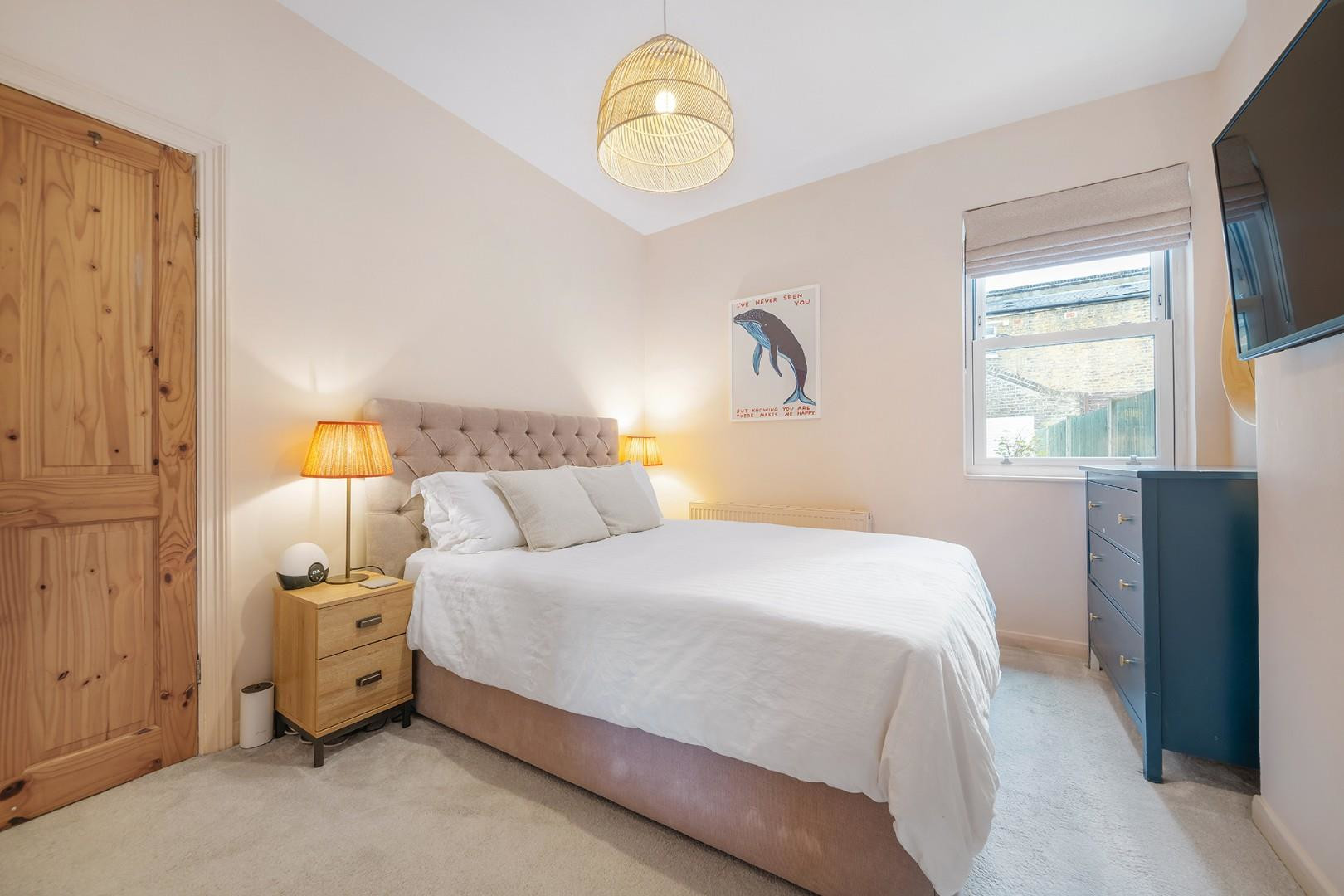 The principal bedroom is a spacious double with a handy wardrobe nook, original wooden door and a lovely peaceful atmosphere enhanced by good insulation and soundproofing, plus a modern sash window overlooking the side return of the garden. Ideal for sharers, the second bedroom sits separately at the rear of the property, a versatile space which is currently a guest room and tranquil home office with French doors to the garden, allowing the fresh air to breeze in. The stylish bathroom is set in a central position for best serving all rooms, equipped with a luxurious double-ended bathtub with rain shower overhead.