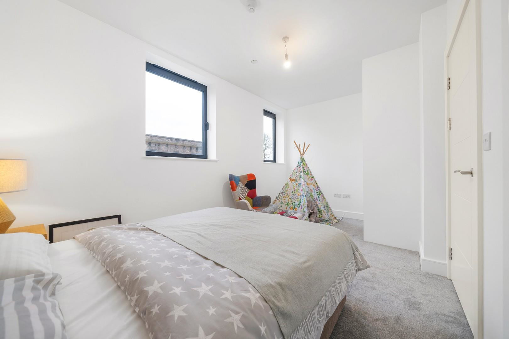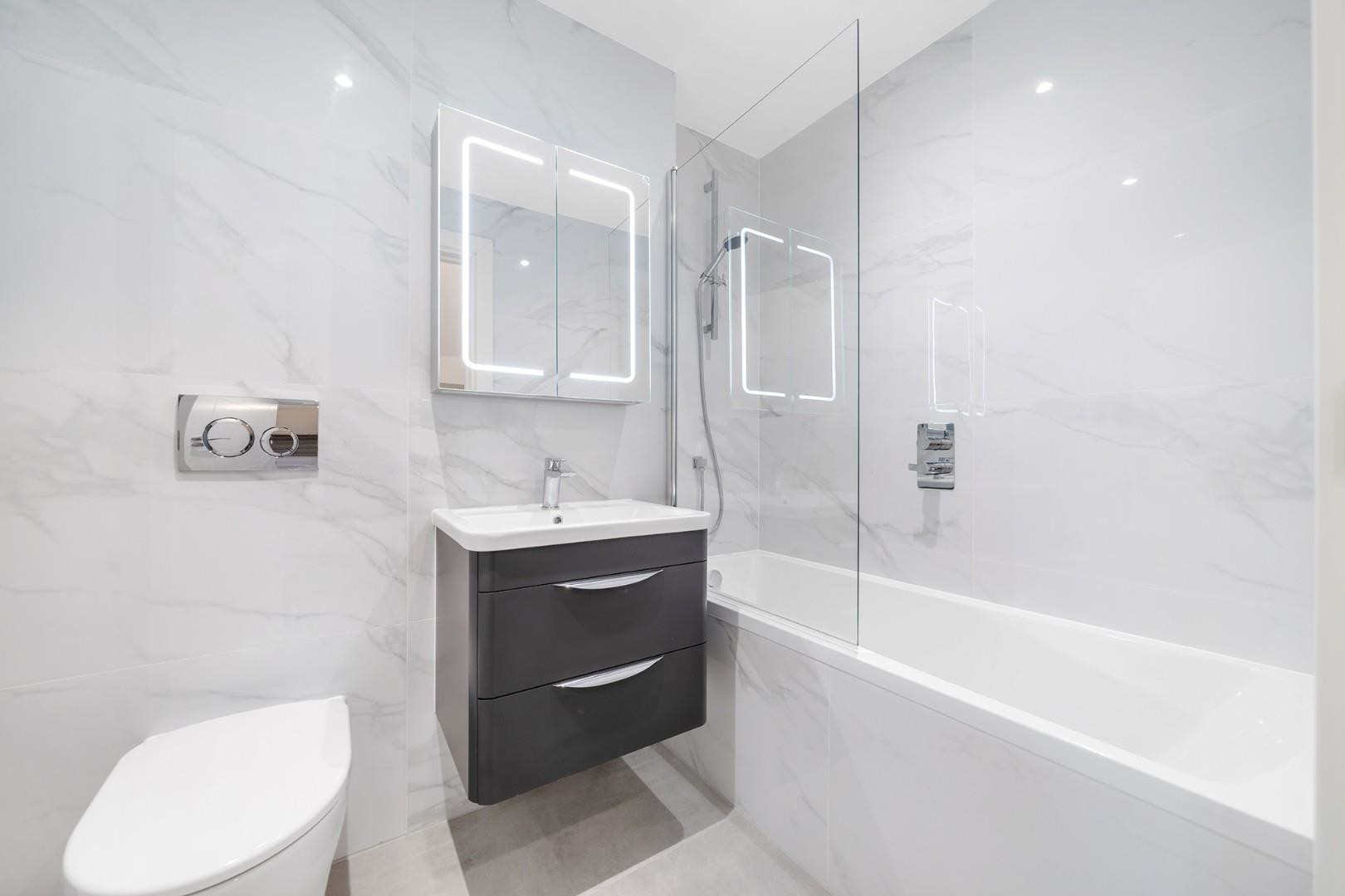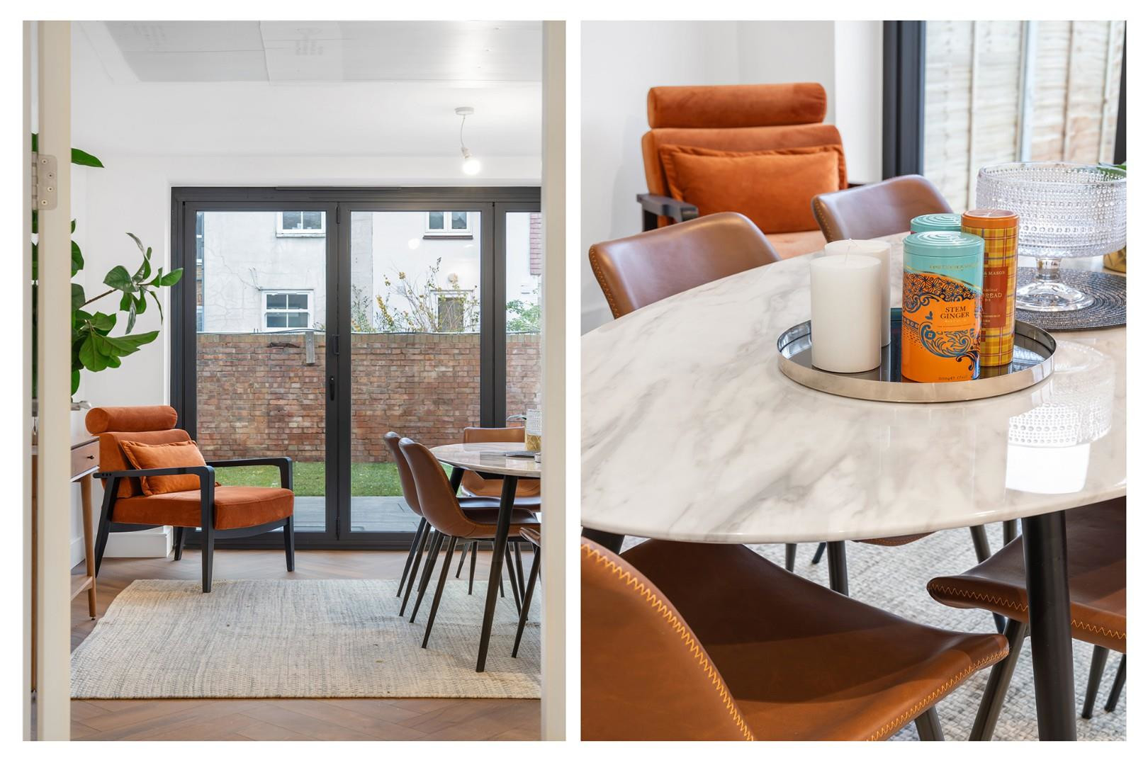 Arranged over the first floor is the first of the bedrooms and a second reception room, this family room boasts large-pane windows and provides an additional space in which to unwind, or provides a fifth bedroom for larger families. The first bedroom is a spacious double featuring a bay window and contemporary en-suite shower room. Two further spacious double bedrooms are nestled over the second floor, sharing the luxurious house bathroom which also separates the rooms to provide privacy for each. The bathrooms are finished with Carrera polished porcelain tiles, electric towel rails and backlit mirrors.