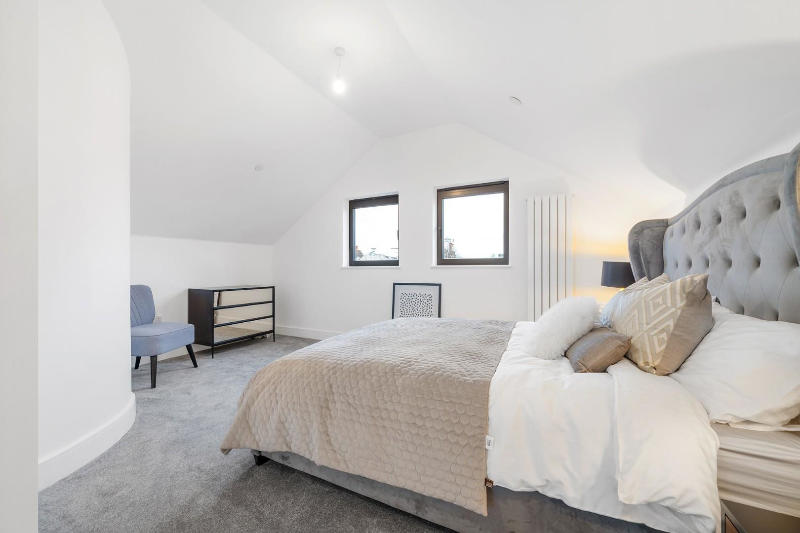 Occupying the entirety of the top floor is an impressive principal suite. This cavernous bedroom has the perfect ambience in which to unwind. An enviable walk-in dressing area leads off the bedroom, sweeping through into an opulent en-suite, stylishly furnished with ‘his and hers’ sinks, with a rain shower over the bathtub ideal for a soak in the bubbles with leafy views.