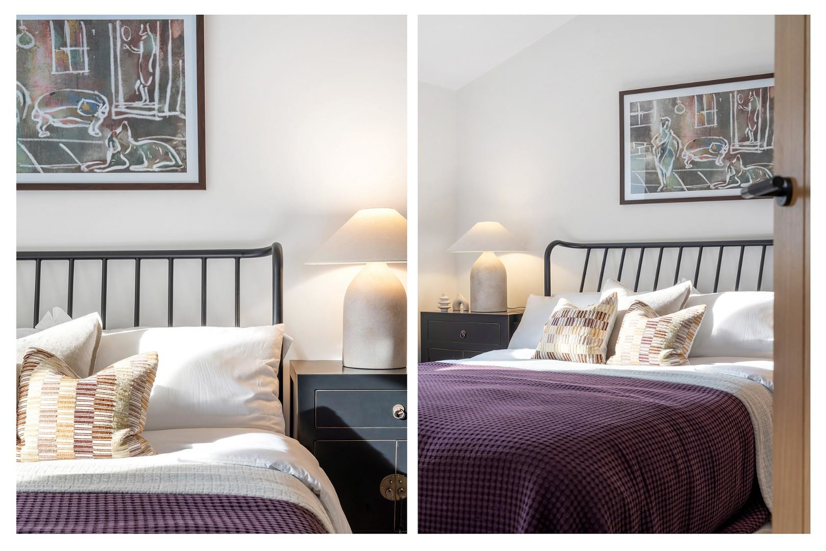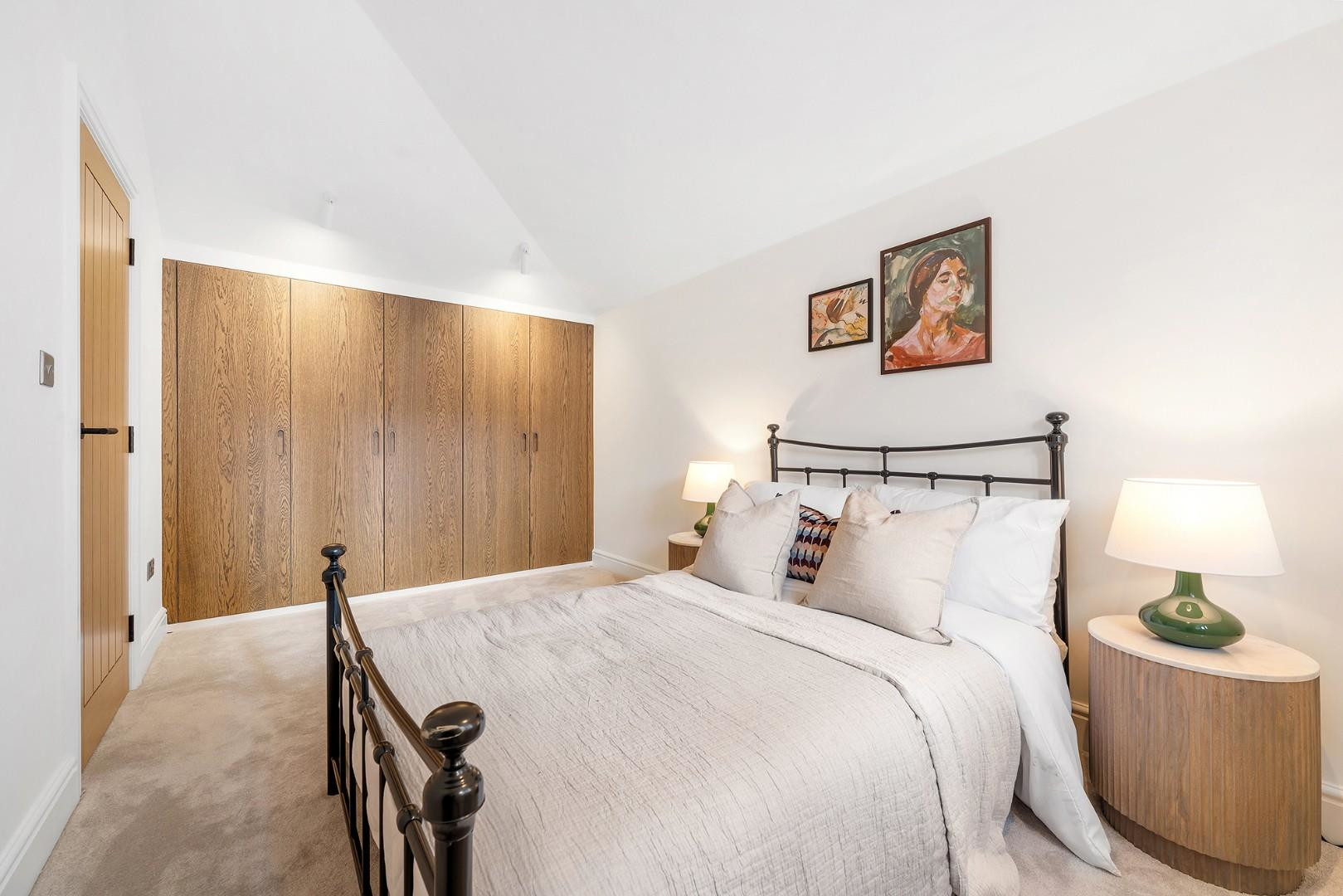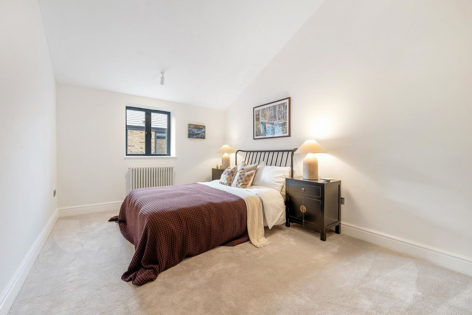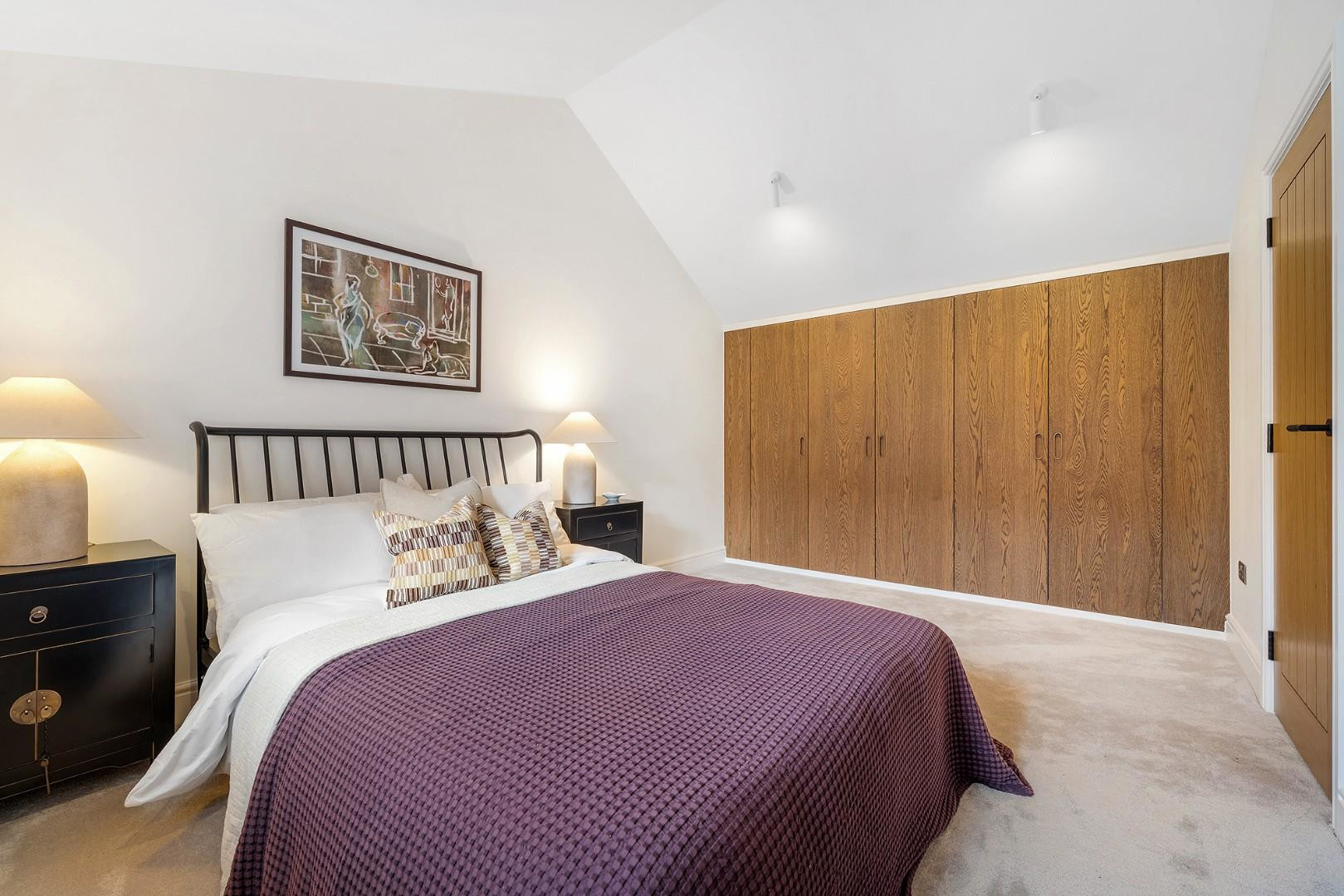 A bespoke oak staircase and balustrading winds up through the centre of home leading to upstairs where two generous bedrooms are peacefully tucked. Each bosting similar proportions, the bedrooms are separated from one another for a desirable level of privacy whilst both still enjoying pretty views over the courtyard. The bedrooms are fitted with bespoke wardrobes and boast a calming yet airy ambience enhanced by plush carpets and lofty ceilings.