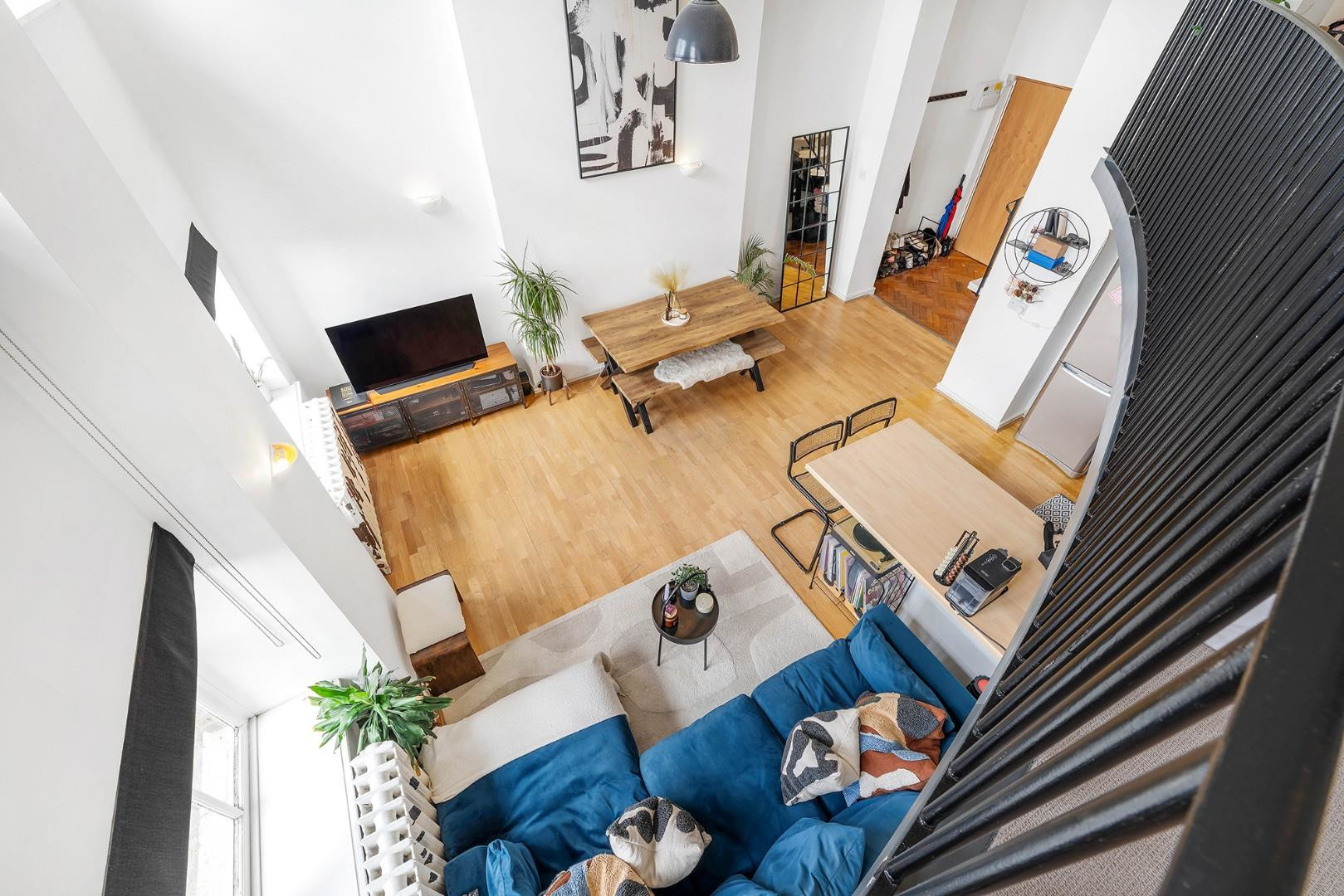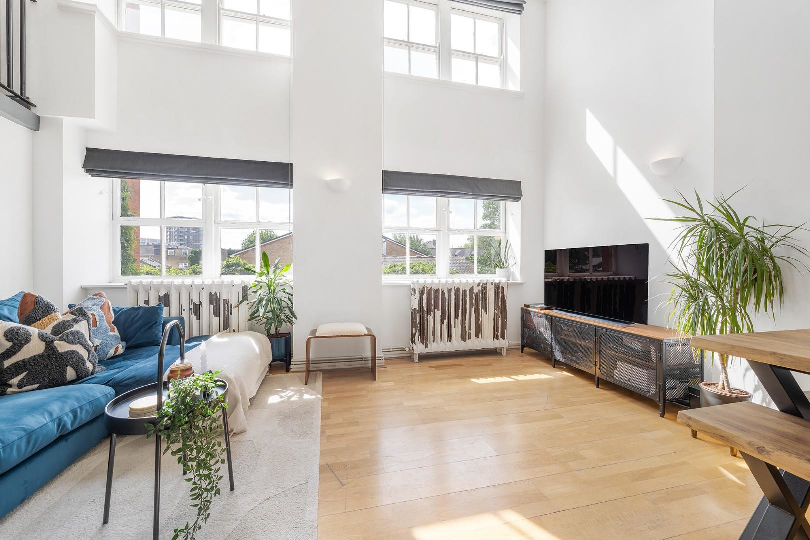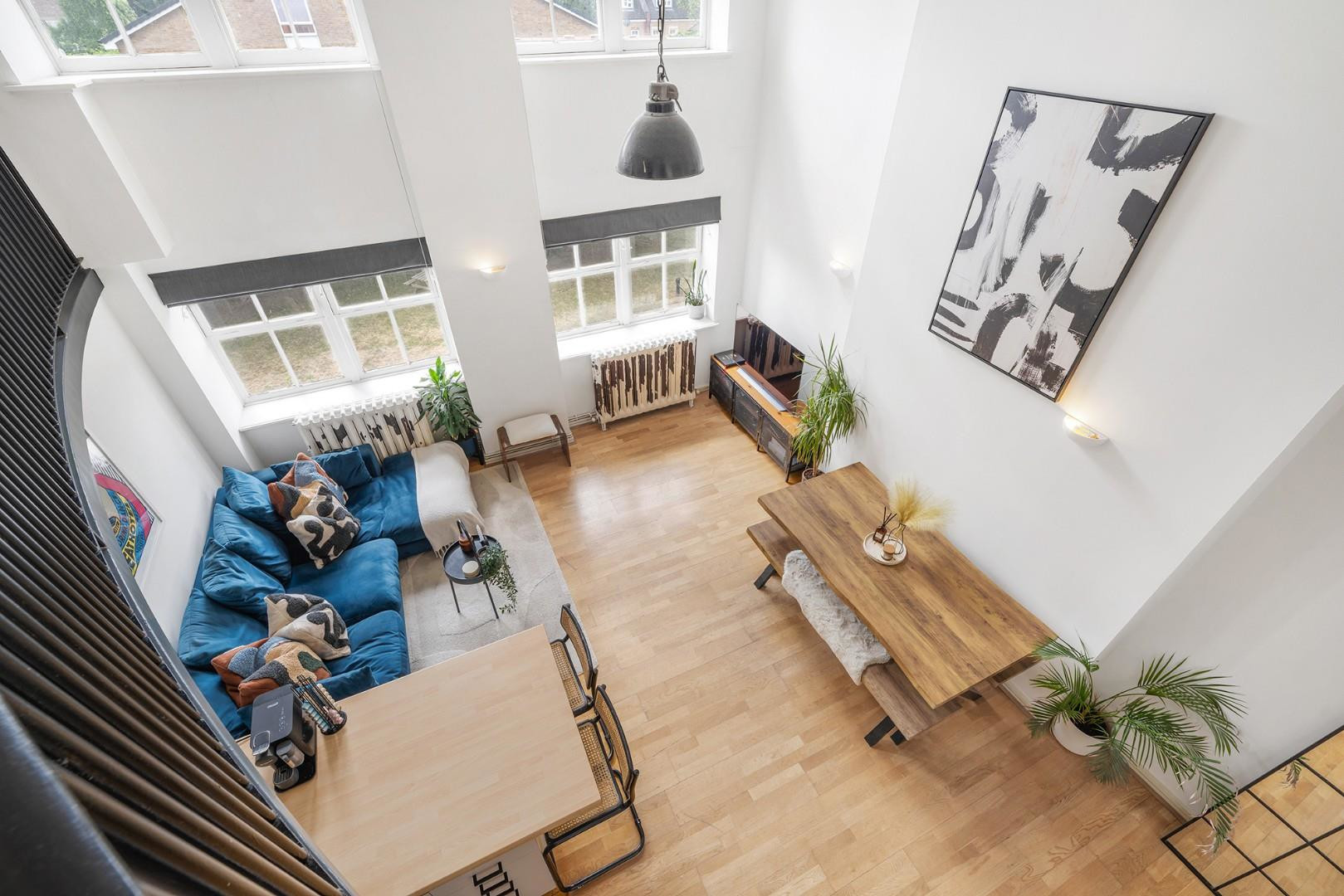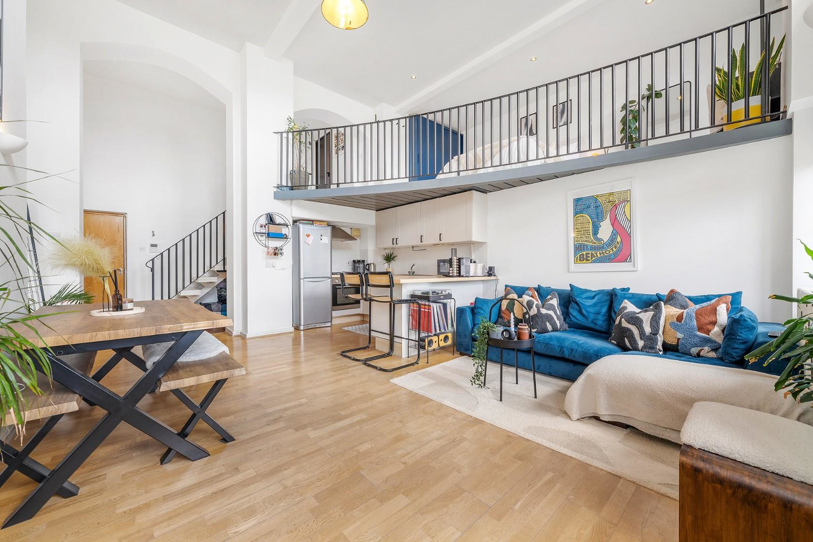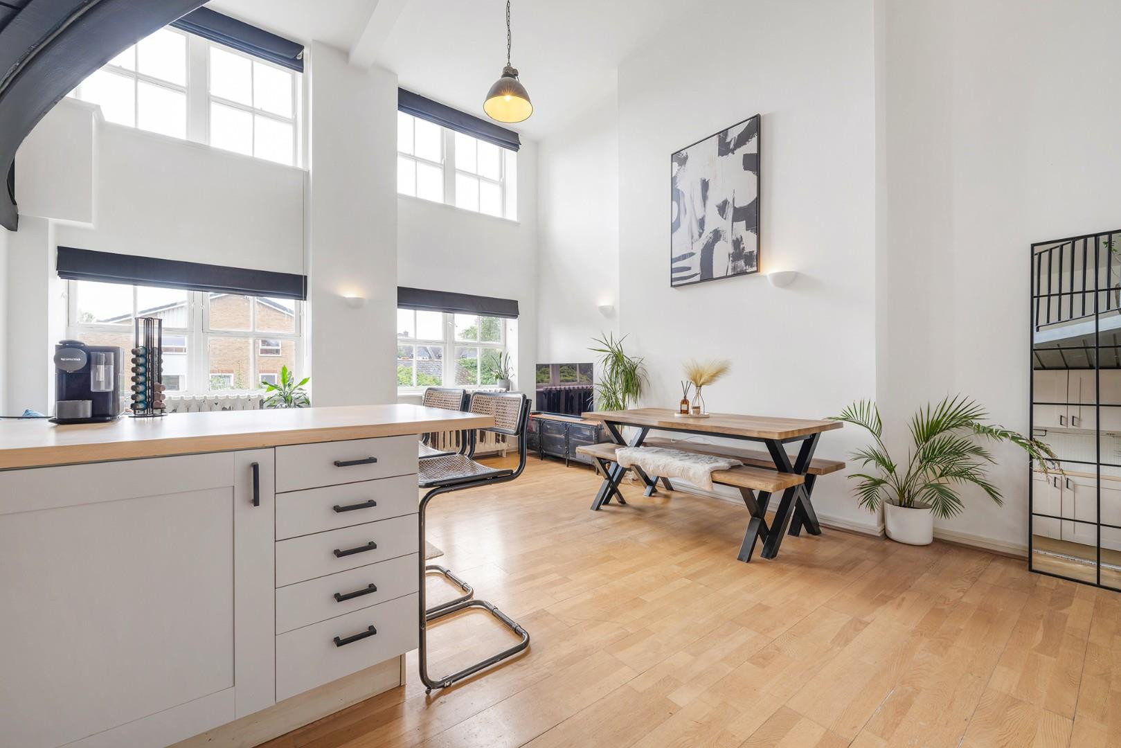 At the heart of the home is a stunning open-plan reception room. Impressive double-height ceilings and large sash windows flood the space with natural light, creating a bright, airy, and welcoming atmosphere. The layout offers ample room to relax, dine, and entertain. Overlooking the space is a stylish mezzanine level, enhancing the architectural character of the home. The contemporary kitchen features shaker style cabinetry and wraparound worktops, ideal for everything from everyday cooking to hosting dinner parties. The generous proportions of the room allow for a full-sized dining table, perfect for enjoying meals while taking in views through the expansive windows.