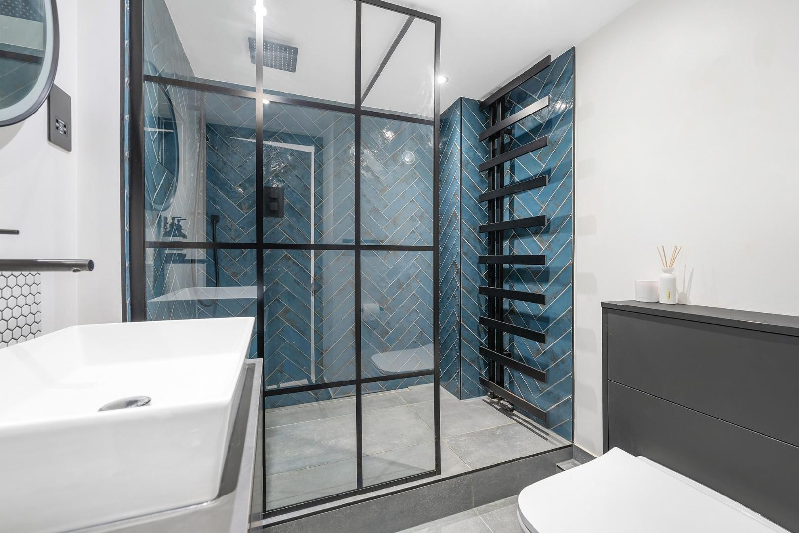 Upstairs, the bedroom sits on the mezzanine level, overlooking the reception. Spacious and neutrally decorated, it enjoys natural light and offers a peaceful retreat. The property also includes a luxurious and contemporary bathroom with a walk-in shower, WC, and vanity unit with built-in storage.