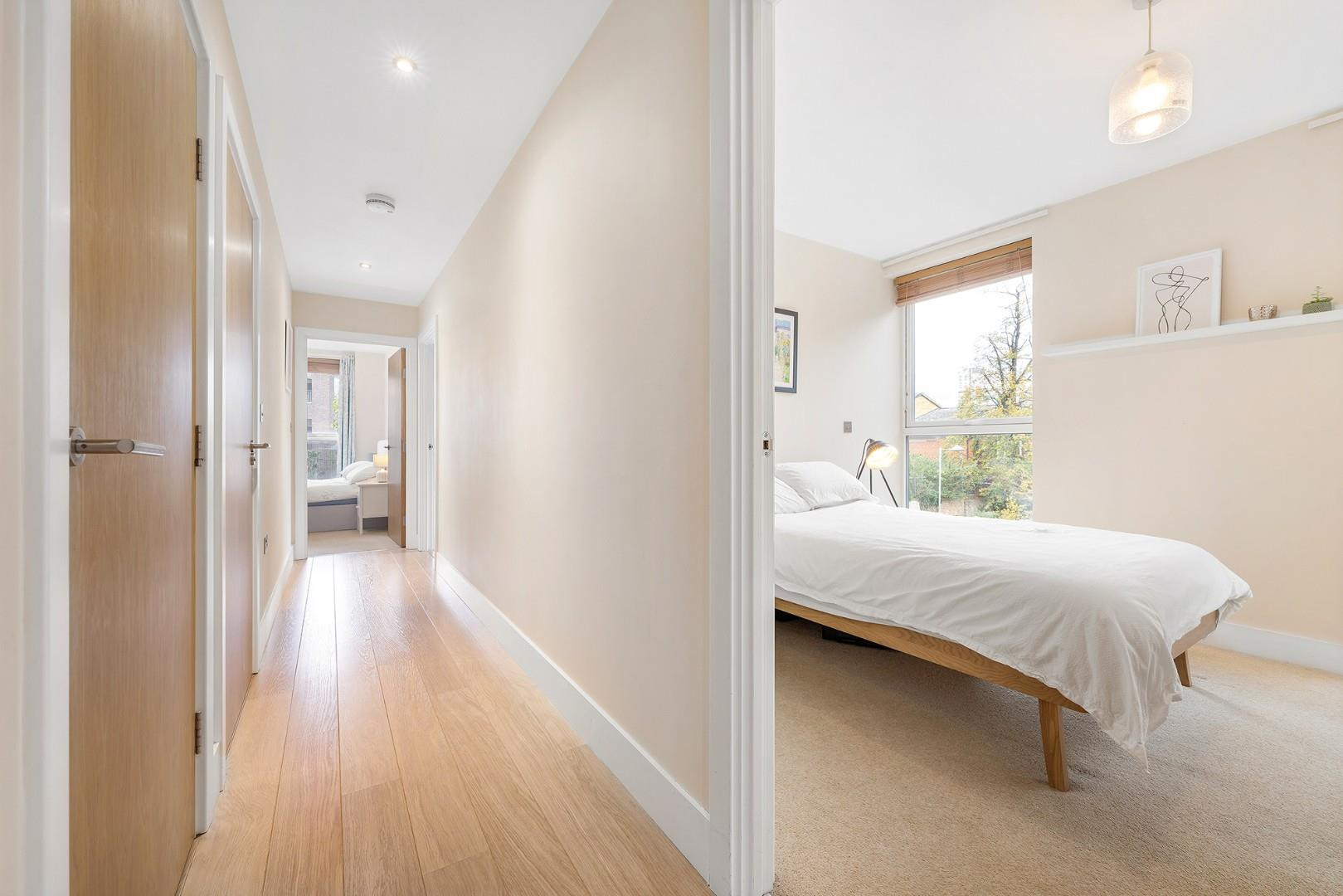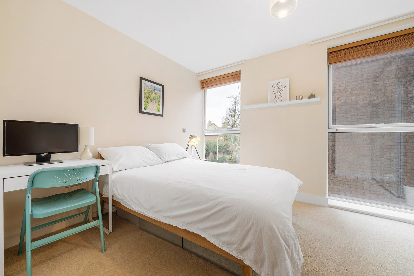 The second bedroom is also a well-proportioned double, featuring two floor-to-ceiling windows that allow plenty of daylight to stream in. There is ample space for wardrobes and additional furnishings, making it perfect as a guest room, home office, or nursery.