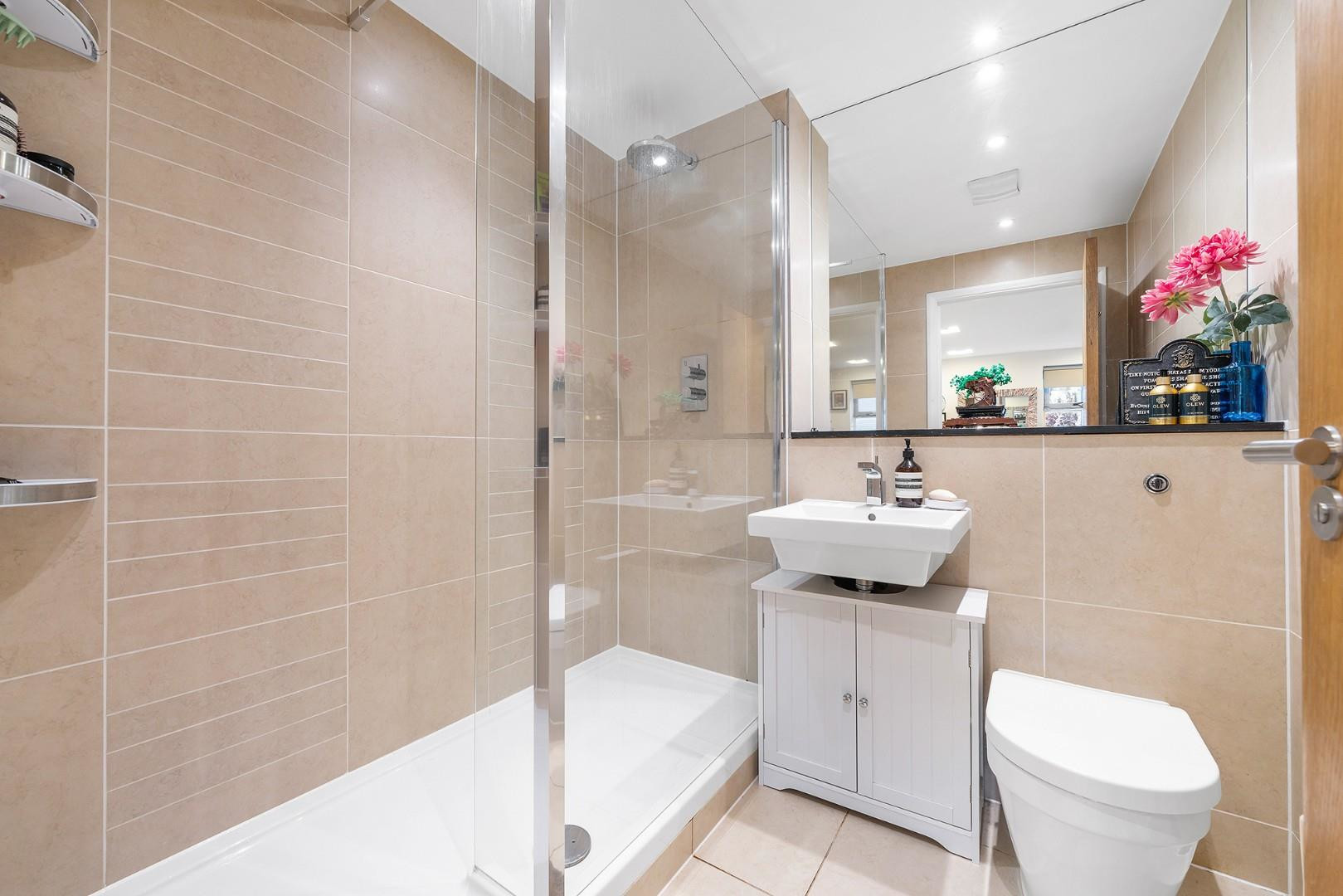 The principal bedroom is positioned to the opposite side of the home, offering excellent proportions, handy storage nooks and the added luxury of an en-suite shower room. Finished to a contemporary standard, the en-suite features a walk-in rain shower for a touch of indulgence. The second bedroom is also a comfortable double, currently arranged as a home office and guest room. Versatile and inviting, this room enjoys direct access to a private terrace—an ideal spot for a morning coffee or a quiet nightcap—and can be easily adapted to suit evolving needs. A further well-appointed bathroom serves the remainder of the property, complete with a bathtub with overhead shower.