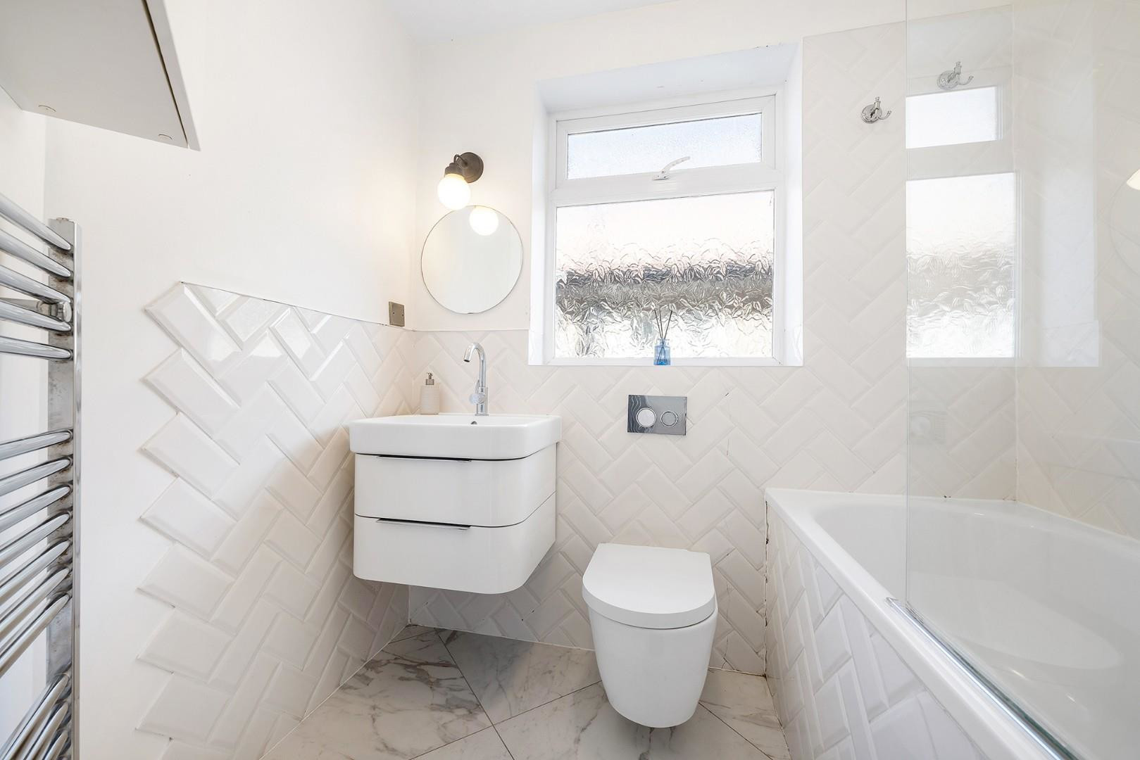 The modern bathroom features a bath with an overhead shower and is finished to a high standard throughout. Clean lines and contemporary fixtures create a calm, stylish space designed for everyday convenience while complementing the overall aesthetic of the home.