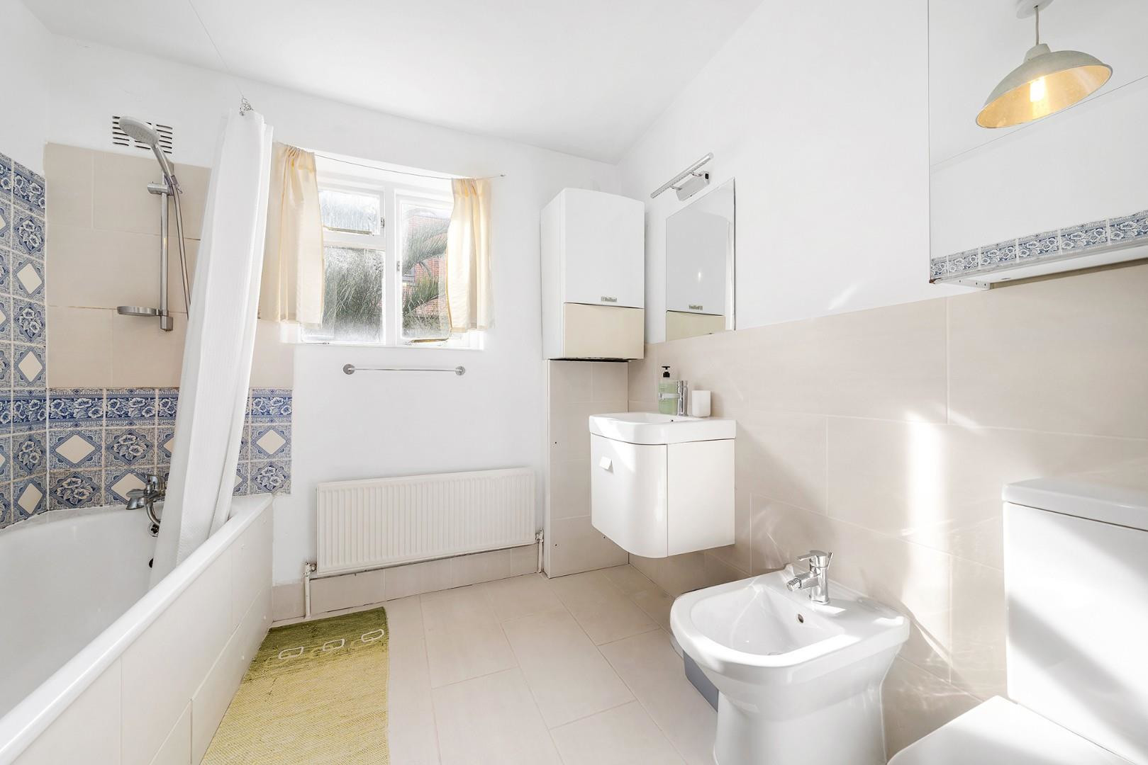 The bedroom is peacefully positioned to the rear of the property and offers a calm retreat, with large sash windows allowing for plenty of natural light. The bathroom is well-sized and bright, featuring a full-sized bathtub with overhead shower and a window for ventilation and daylight, enhancing the sense of space.