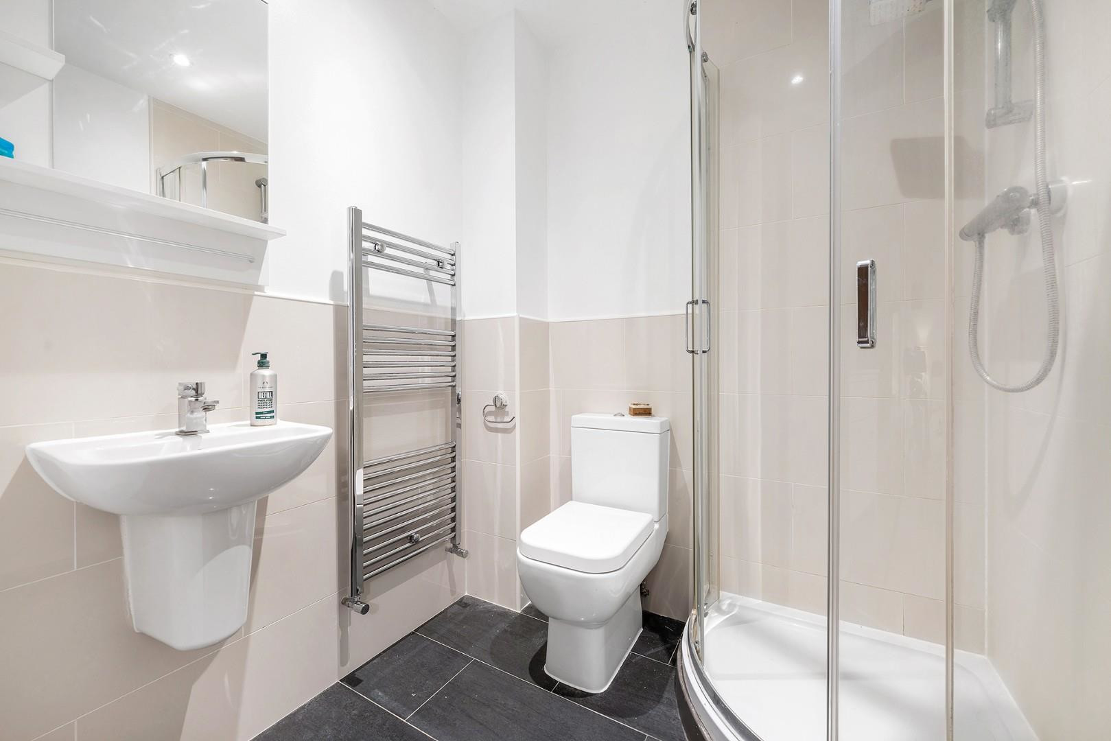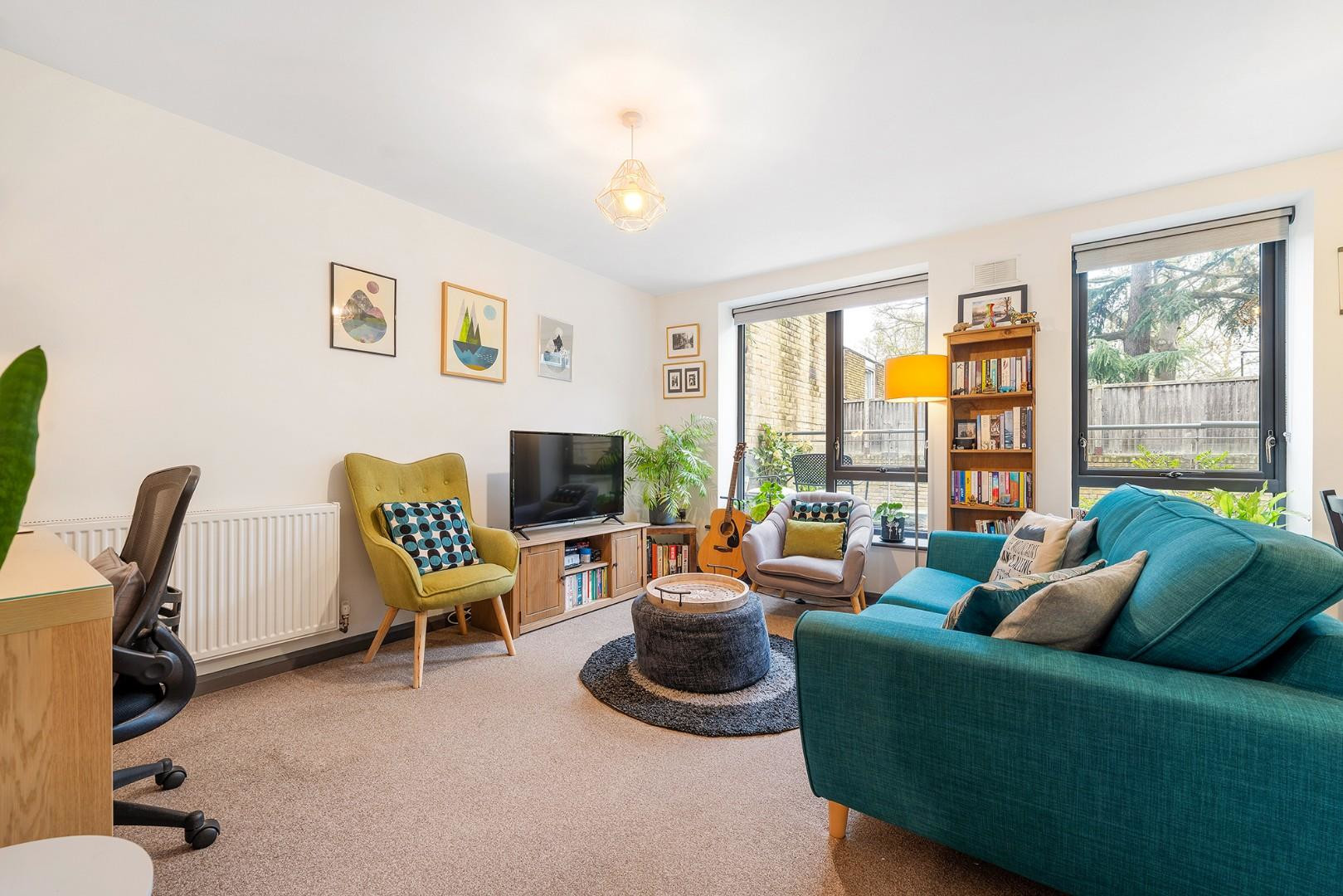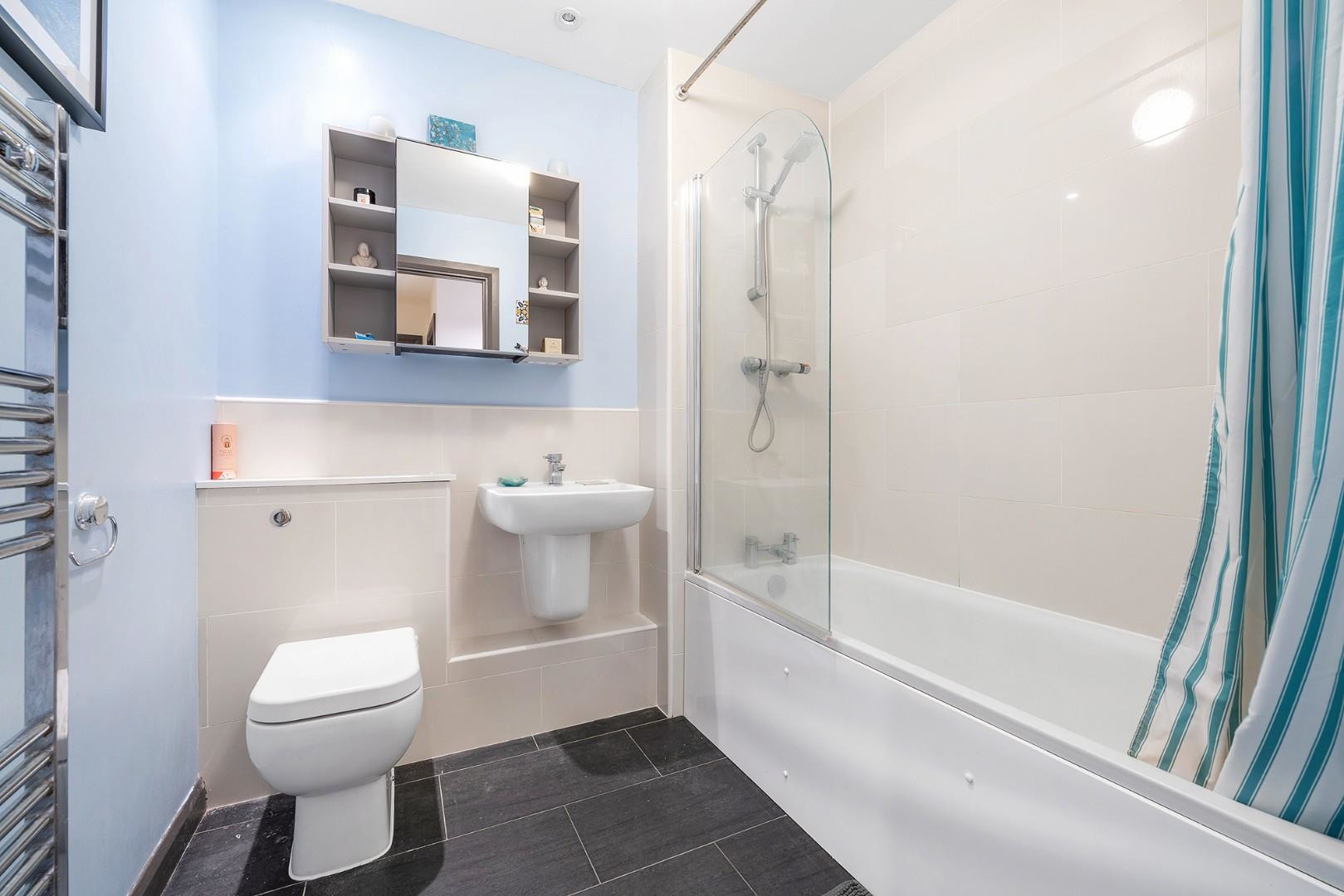 Both bedrooms enjoy a soothing atmosphere, with large windows, tastefully neutral décor and plush carpets. The principal bedroom boasts particularly generous proportions, allowing for plenty of wardrobe space plus a desk or dressing table if desired, and benefits from the luxury of an en-suite shower room. A versatile space, the second bedroom is currently a home office and guest room, with the potential to re-purpose with a double bed if desired. The bathroom is tastefully styled and equipped with a bathtub plus overhead shower. Finally, this lovely home is completed by spacious entrance hallway, inclusive of a handy storage cupboard, and a Hive heating system.