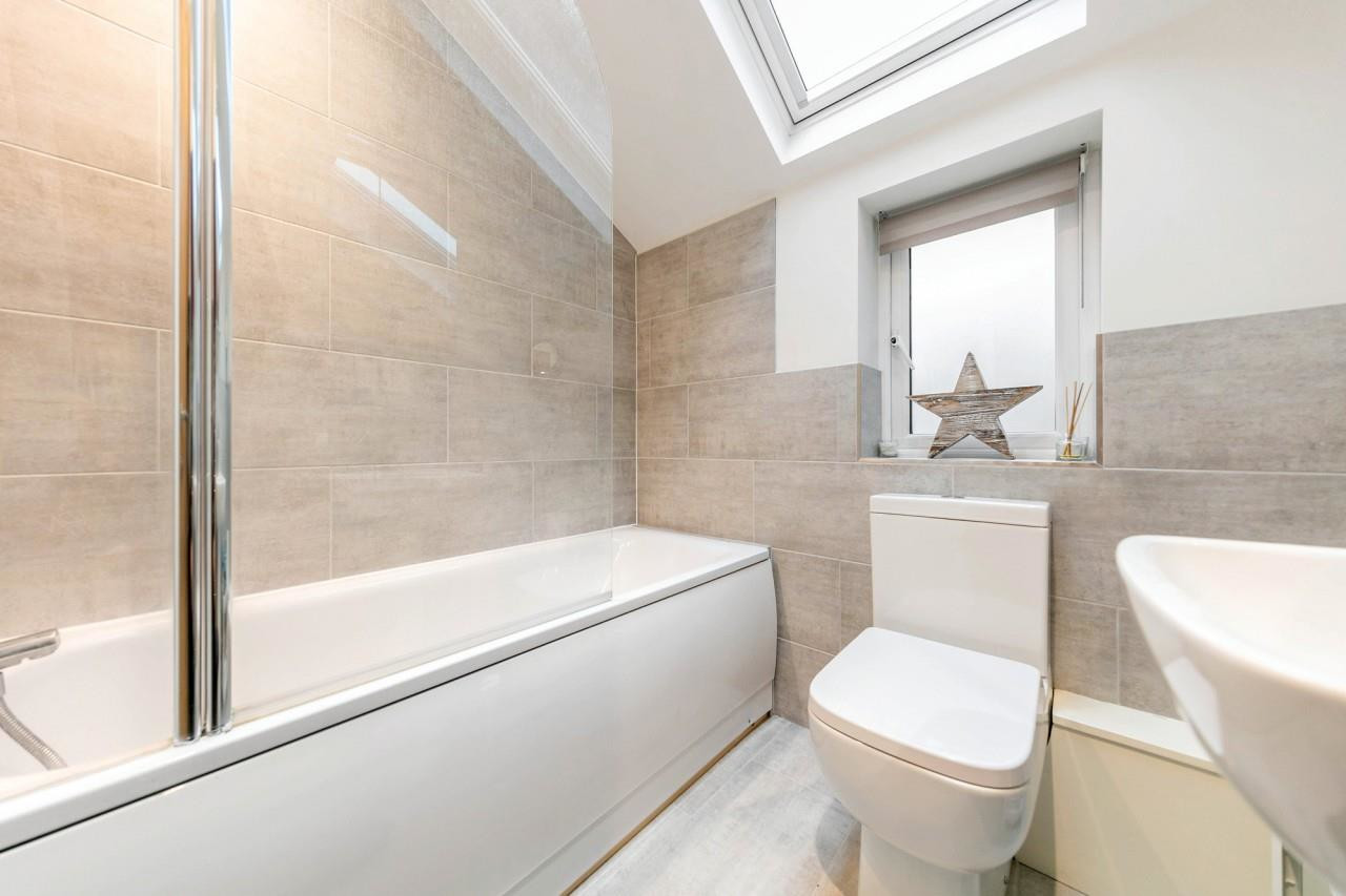 The bedroom is nestled towards the rear, with views of the nearby gardens below and great storage options. The space is tranquil and perfect for peaceful nights. In keeping with the rest of the property, the bathroom is tastefully yet neutrally finished, with a bathtub plus overhead shower, set below another large Velux window.