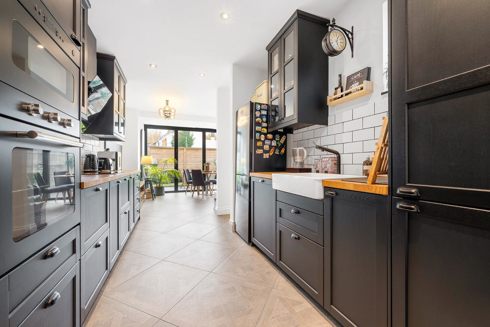 To the rear, the home opens into an impressive open-plan kitchen, dining, and reception area that forms the heart of the home. This sociable and stylish space has been thoughtfully designed for modern living, with bi-fold doors opening directly onto the south-facing garden, allowing light to flood the room and creating an easy flow between indoors and outdoors. The kitchen itself is striking, featuring black cabinetry with sleek worktops, a white subway tile splashback, a traditional butler sink, and fully integrated appliances. This seamless design is complemented by ample space for dining and relaxing, making it ideal for entertaining or family life.
