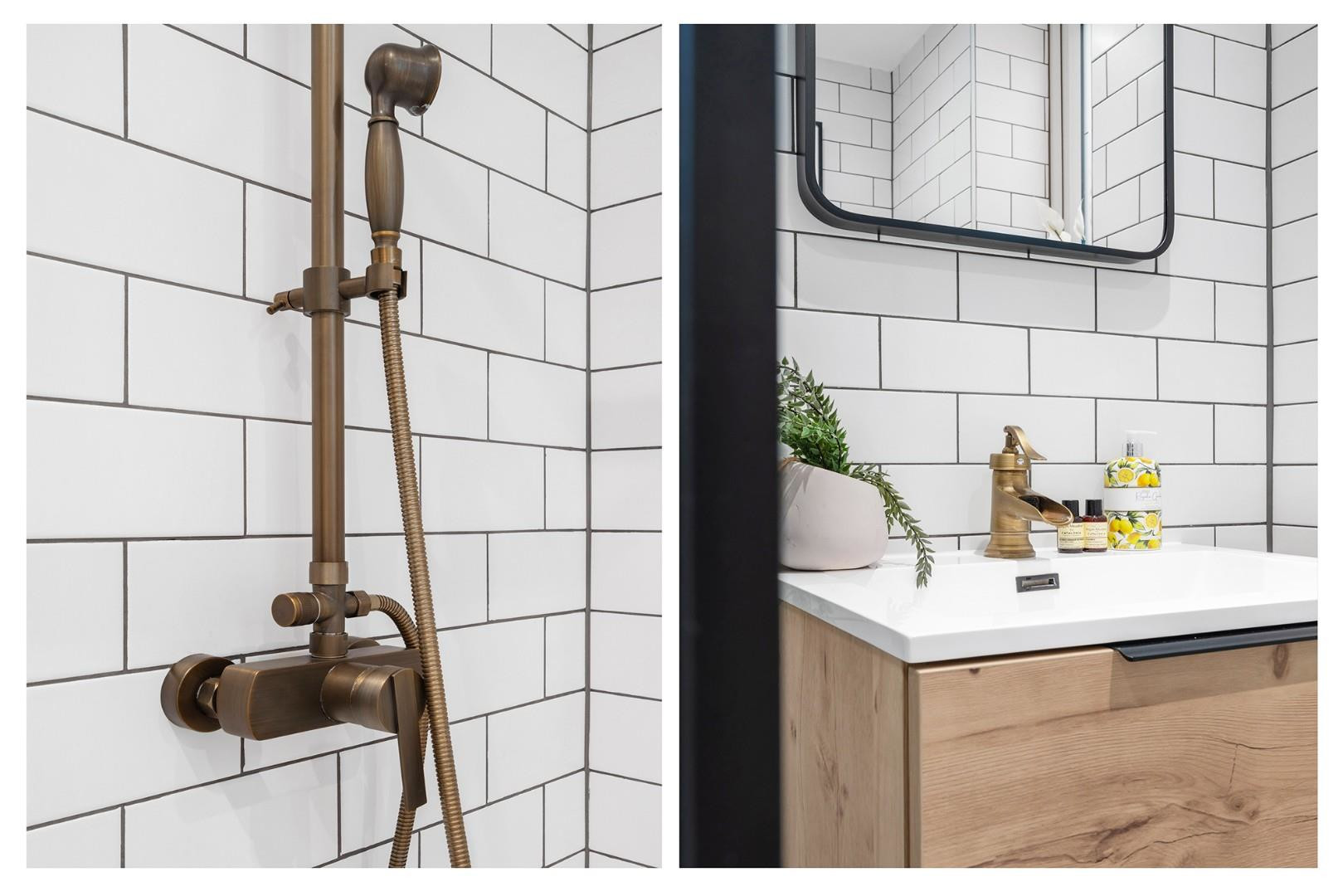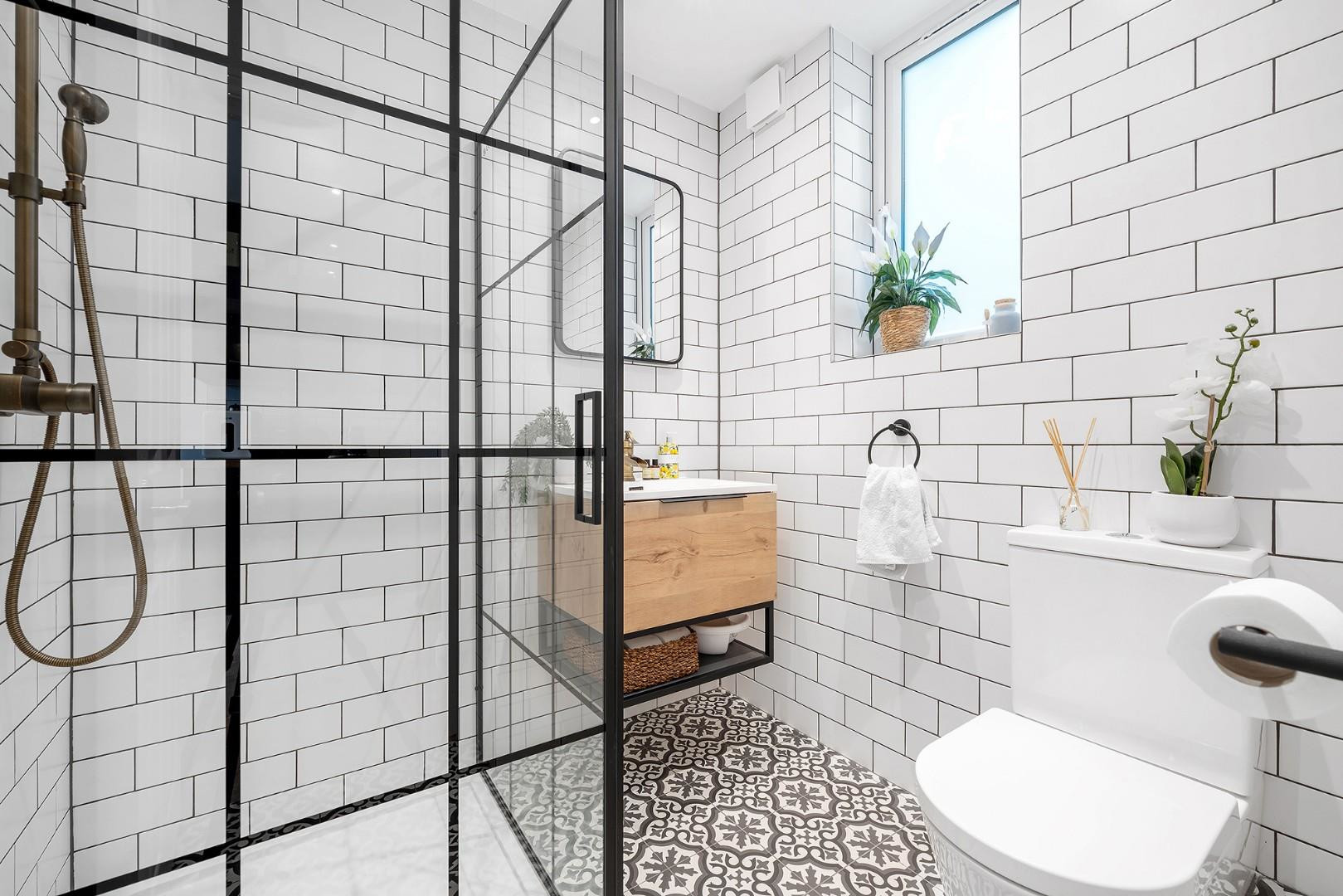 A fully tiled downstairs bathroom sits conveniently off the kitchen area. It features a black Crittall-style shower enclosure, white subway tiles, geometric patterned floor tiles, a vanity unit with sink, and stylish fittings throughout.