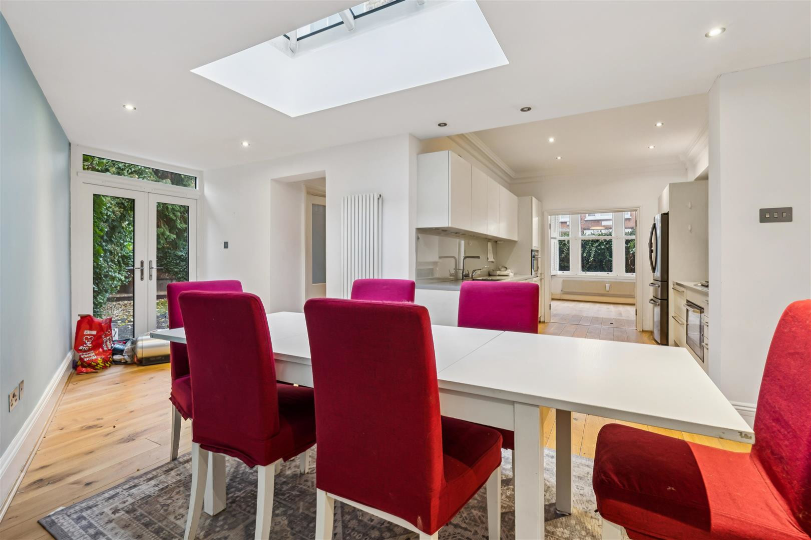 Contemporary and stylish the dine-in kitchen is sleek, a large and airy room designed with immaculate attention to detail, providing the ideal family hub. A fully integrated kitchen is complete with high-end appliances, abundant storage options. There are comfortable dimensions for a large dining table and multiple skylights running the length of the room add to the appealing atmosphere. The garden is vast and a sizeable BBQ area, perfect for hosting dinner whilst relishing nature with views.