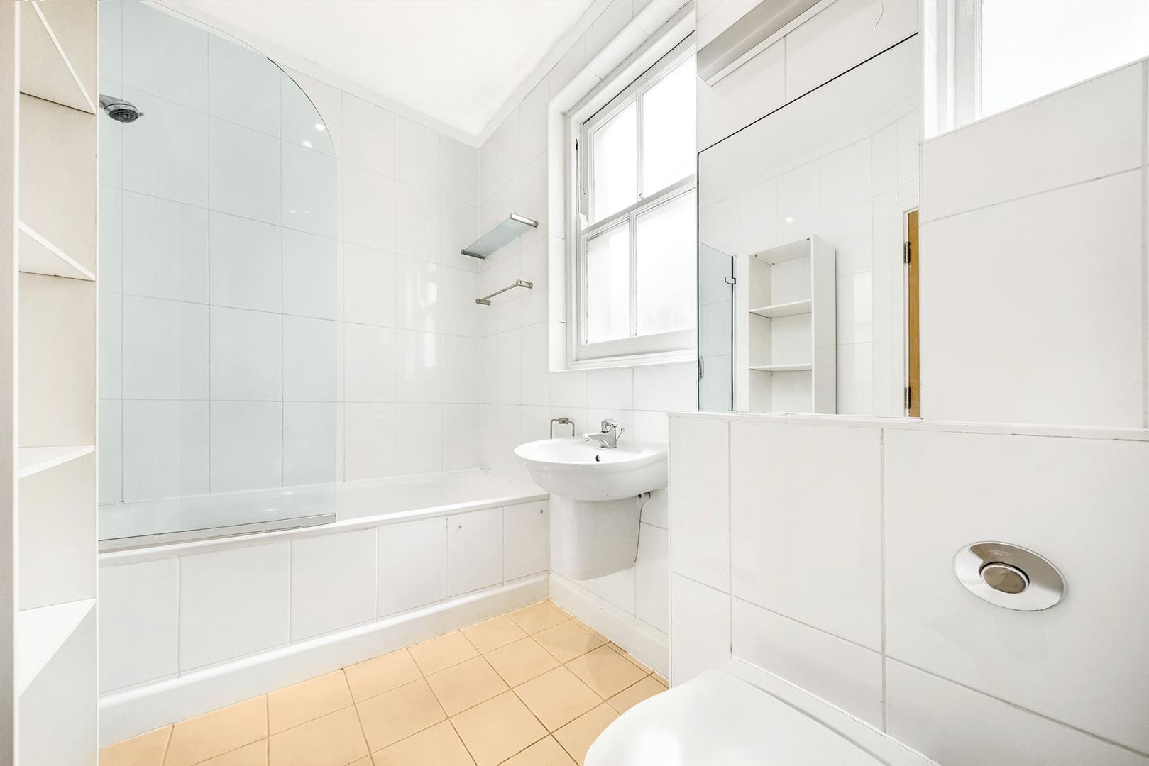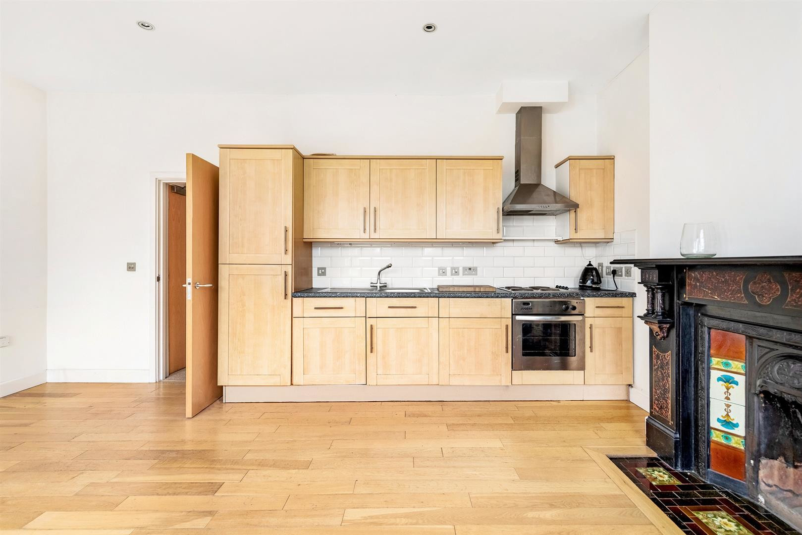 The flat comprises a spacious open-plan kitchen and living area featuring a character fireplace, hardwood flooring, and large sash windows that flood the room with natural light. The fully integrated kitchen includes plenty of worktops. There are two well-proportioned double bedrooms and a modern bathroom.