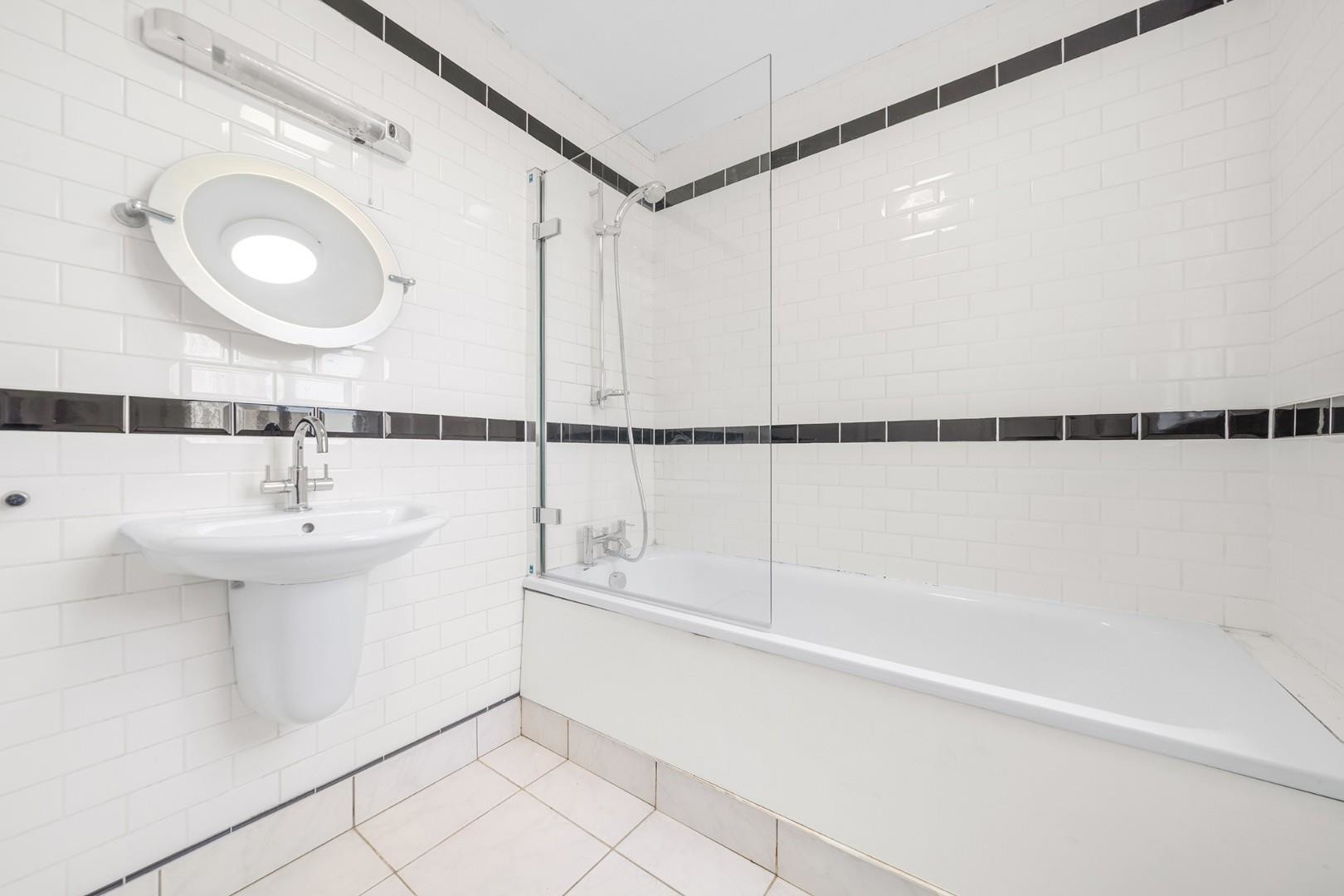 Set to the rear of the home with leafy views over the nearby gardens, the bedroom is well-proportioned and peaceful, benefitting from an abundance of wardrobe space and a tranquil setting. The split-level design enhances the feeling of space, with the bathroom conveniently located on the floor below, down a charming staircase. Neutrally presented and spacious, the bathroom is equipped with a bathtub with overhead shower, with pretty views through the window.