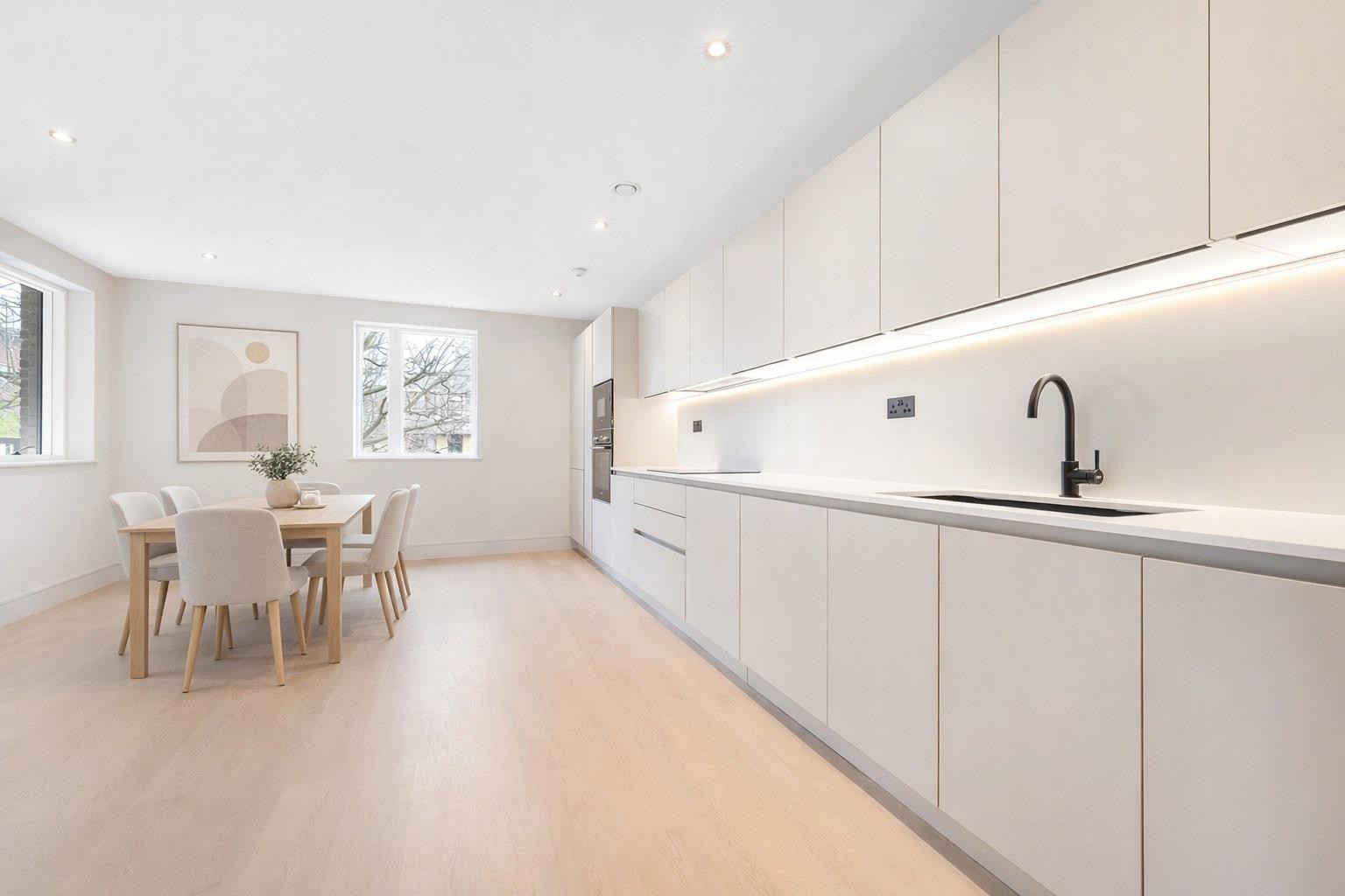 With over 750 square feet of internal space this sizeable first floor apartment boasts a wonderfully bright and airy open-plan reception room with modern features such as down lighting, large windows and softly toned flooring. A fantastic entertaining space sure to wow guests, there is comfortable room to lounge in style, dine around a large table or cook up a tasty treat in the superb kitchen. Designed and manufactured in Italy, the kitchen integrates Bosch appliances and generous storage within contemporary cabinetry, topped with a quartz work surface and splashback, and finished with a Franke Maris black tap.