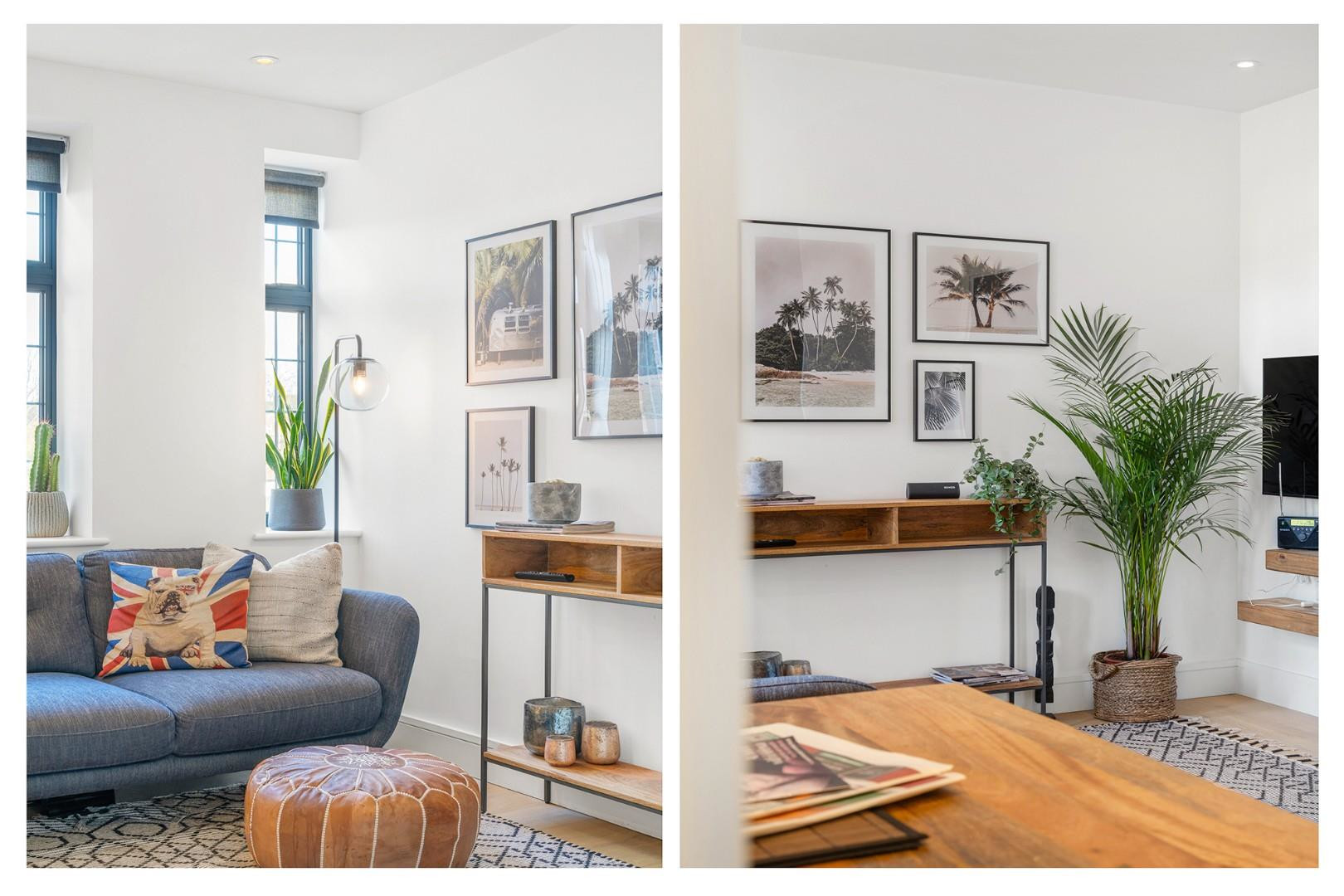 The open-plan living space is designed with both form and function in mind. The sleek kitchen sweeps effortlessly down one wall, featuring stylish contrasting cabinetry, integrated appliances, and ambient worktop lighting, creating an inviting atmosphere—perfect for relaxed dining or entertaining. The lounge area is bathed in natural light, complemented by contemporary décor and modern flooring adding a cosy touch.