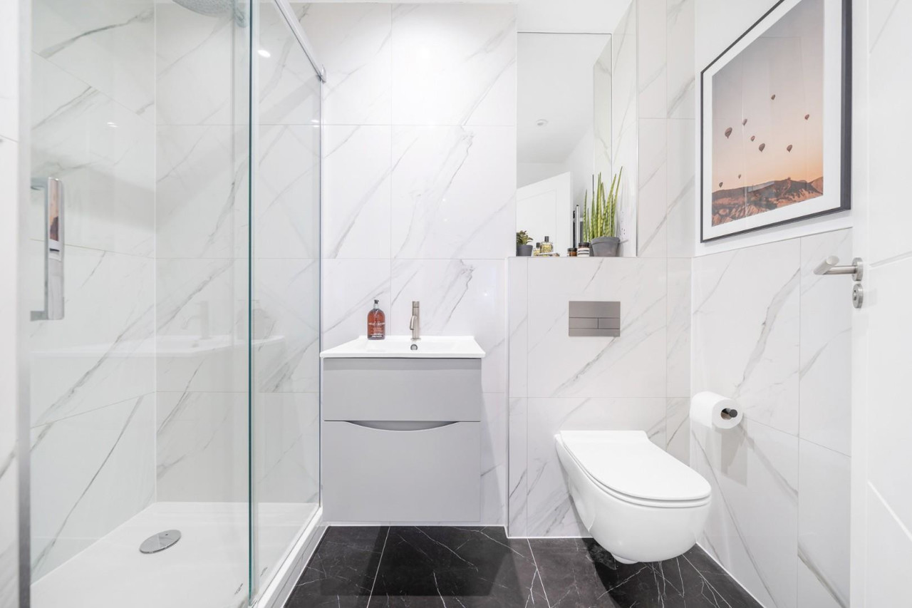 The bedroom is a serene retreat, complete with plush carpeting, bespoke fitted wardrobes, and direct access to the terrace—an idyllic setting for slow weekend mornings with a coffee or peaceful evening stargazing. The bathroom epitomises modern luxury, fitted with a high-end walk-in rain shower and chic floating under-sink storage, all set against a backdrop of sophisticated tiling.