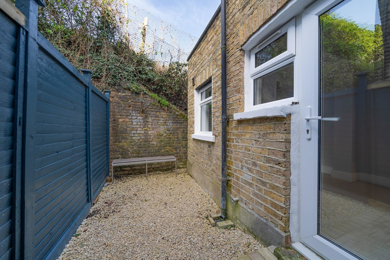 Thoughtfully arranged for privacy, the two bedrooms are set apart from one another. The principal bedroom is positioned at the front of the home, bathed in natural light from a grand sash bay window dressed with elegant plantation shutters. The second bedroom enjoys direct access to the garden, offering a peaceful and secluded feel. A modern and neutral bathroom serves the home, complete with a bathtub and overhead rain shower, plus under-sink storage for added convenience.