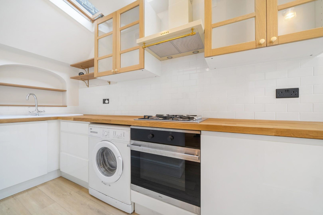 The heart of the home is the impressive open-plan reception, where engineered flooring sweeps through the space, complementing the charming feature fireplace. With generous proportions to accommodate both lounge and dining areas, the room flows seamlessly into the stylish kitchen, which is thoughtfully positioned to one side. Set below skylights that invite in an abundance of natural light, the kitchen is finished with sleek neutral cabinetry, warm wooden worktops, trendy shelves, and an arched storage nook above the sink. Double doors open directly onto the private garden, creating an effortless connection between indoor and outdoor living.