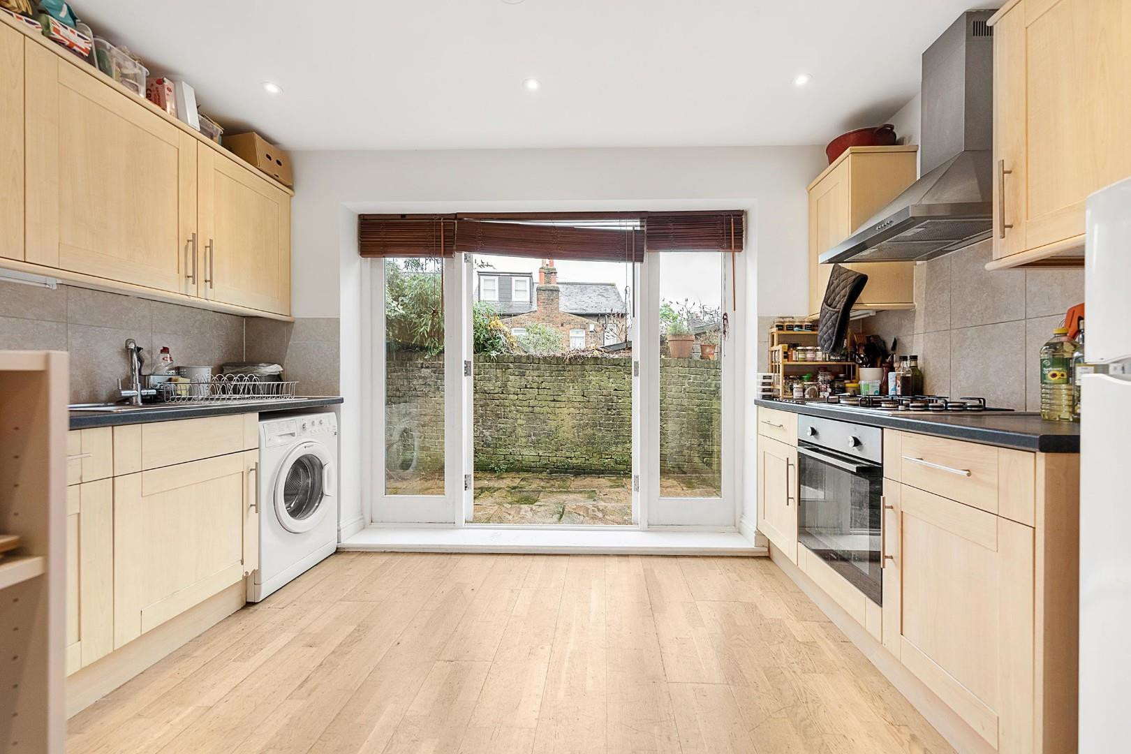 The fantastic open plan reception room to the rear, which makes use of all available space creating a fantastic hub in which to relax, dine and entertain. Multiple windows create a light and airy atmosphere throughout the room. A contemporary kitchen runs along two walls to the rear, designed to cater to both culinary enthusiasts and casual cooks alike, making it a wonderful spot for gatherings with family and friends. Two sets of French doors from both the kitchen and reception allow a transition out to the low-maintenance private garden, a wrap-around space which offers a tranquil escape from the hustle and bustle, with the potential to dress with pot plants or re-landscape if desired.