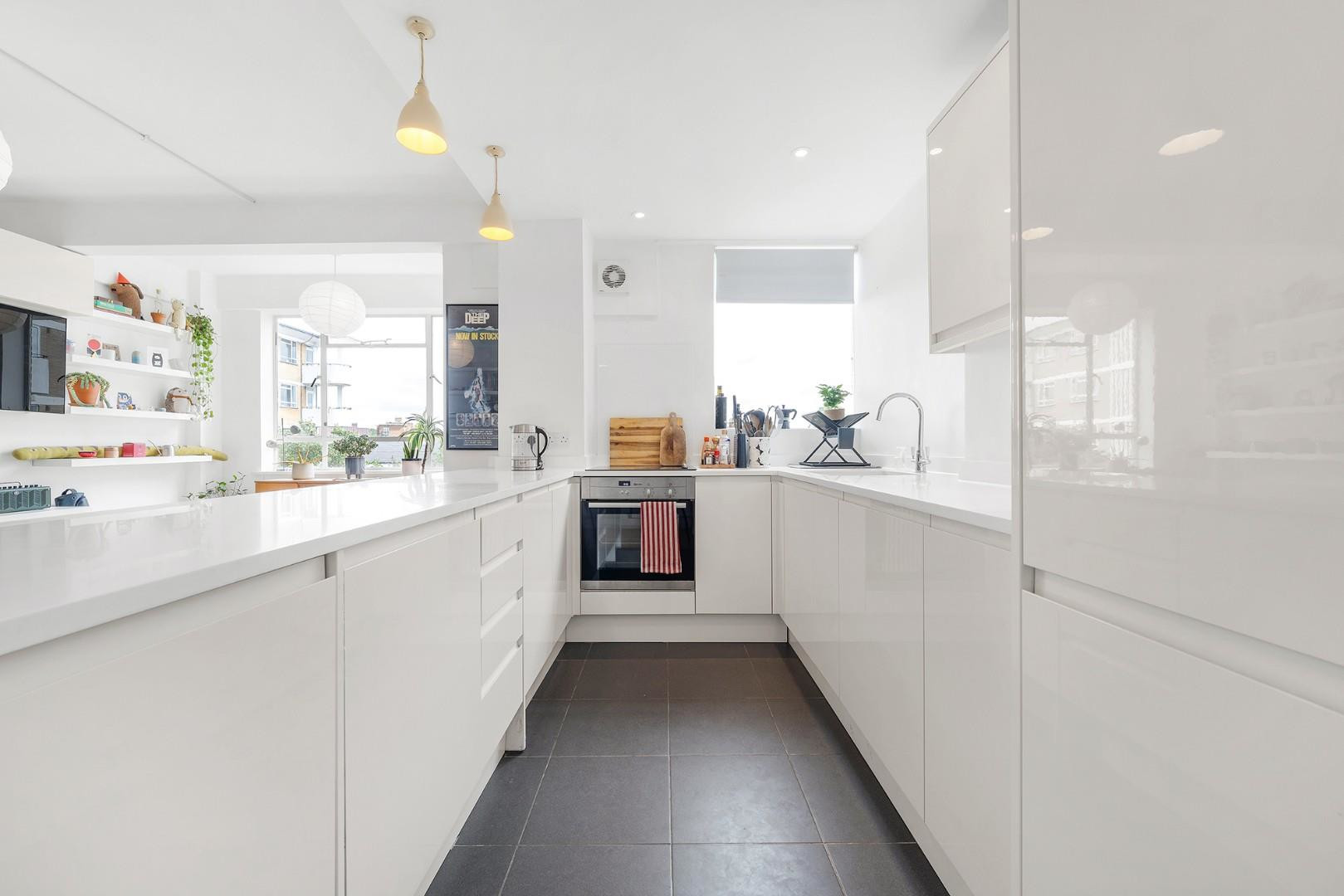 A rarity for properties in this building, the kitchen and reception have been combined into one expansive room, creating a true heart of the home. This inviting space boasts high ceilings and great dimensions with plenty of space for both relaxing and entertaining - a wonderful spot sure to be treasured. Contemporary and ergonomic, the kitchen features integrated appliances within sleek white cabinetry, wrapping around to maximise worktop and storage space, creating a sociable vibe with a breakfast bar. There is plenty of room in the living are for a desk or dining table in addition to a comfortable lounge area.