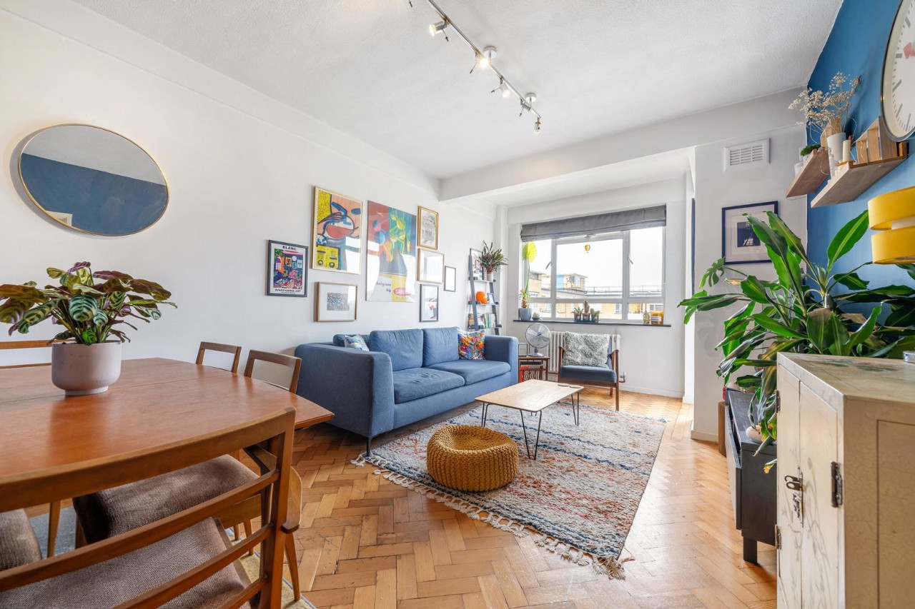 Perched on the uppermost floor, the apartment enjoys an abundance of natural light and a heightened sense of privacy, raising the apartment well above street level. The generously proportioned reception room is a true centrepiece, offering a welcoming and stylish environment to relax and entertain. Characterful parquet flooring runs underfoot, complementing striking blue feature walls which add depth and charm. Large windows add to the appeal, with a patio door leading out to the private terrace.