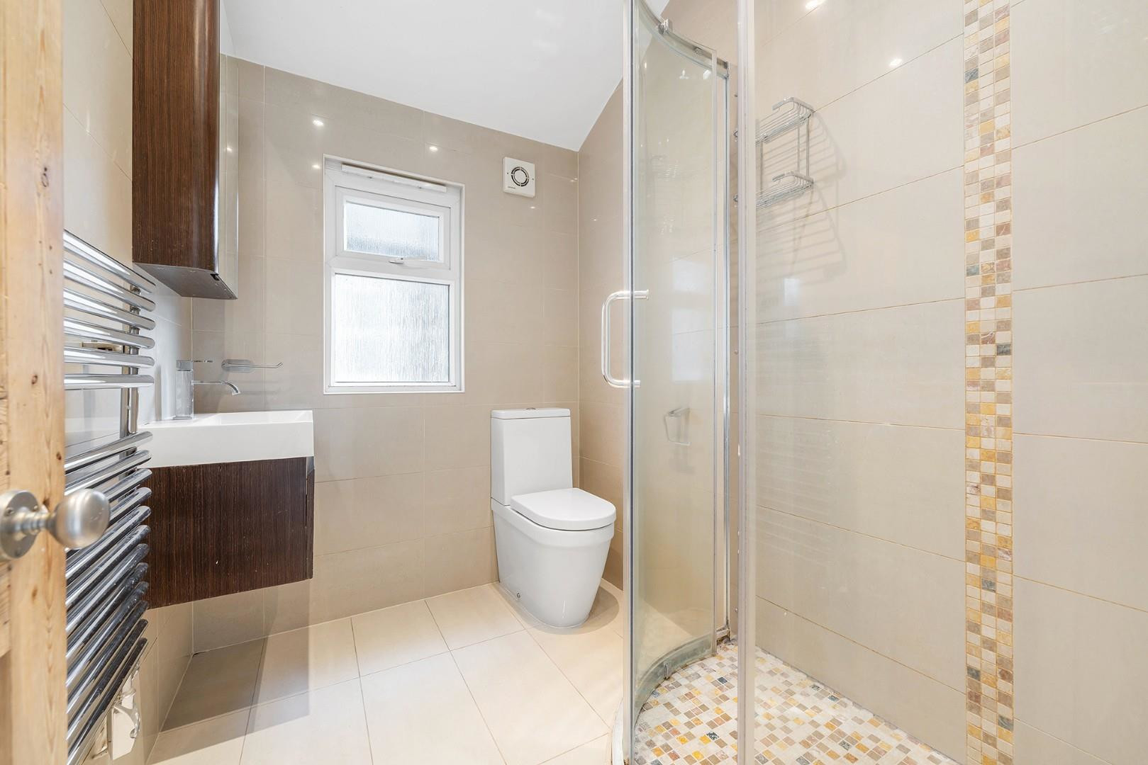 The bedroom on this first floor benefits from a peaceful outlook and good levels of natural light. A decorative fireplace is the focal point of the room, with built in storage too. This is a versatile space which can be repurposed to a guest room, home office or nursery if both bedrooms are not required. A smart, neutral tiled family bathroom features a walk-in shower, wash basin with vanity storage, and WC. The space is well ventilated and attractively finished with modern fixtures and fittings including a towel rail.