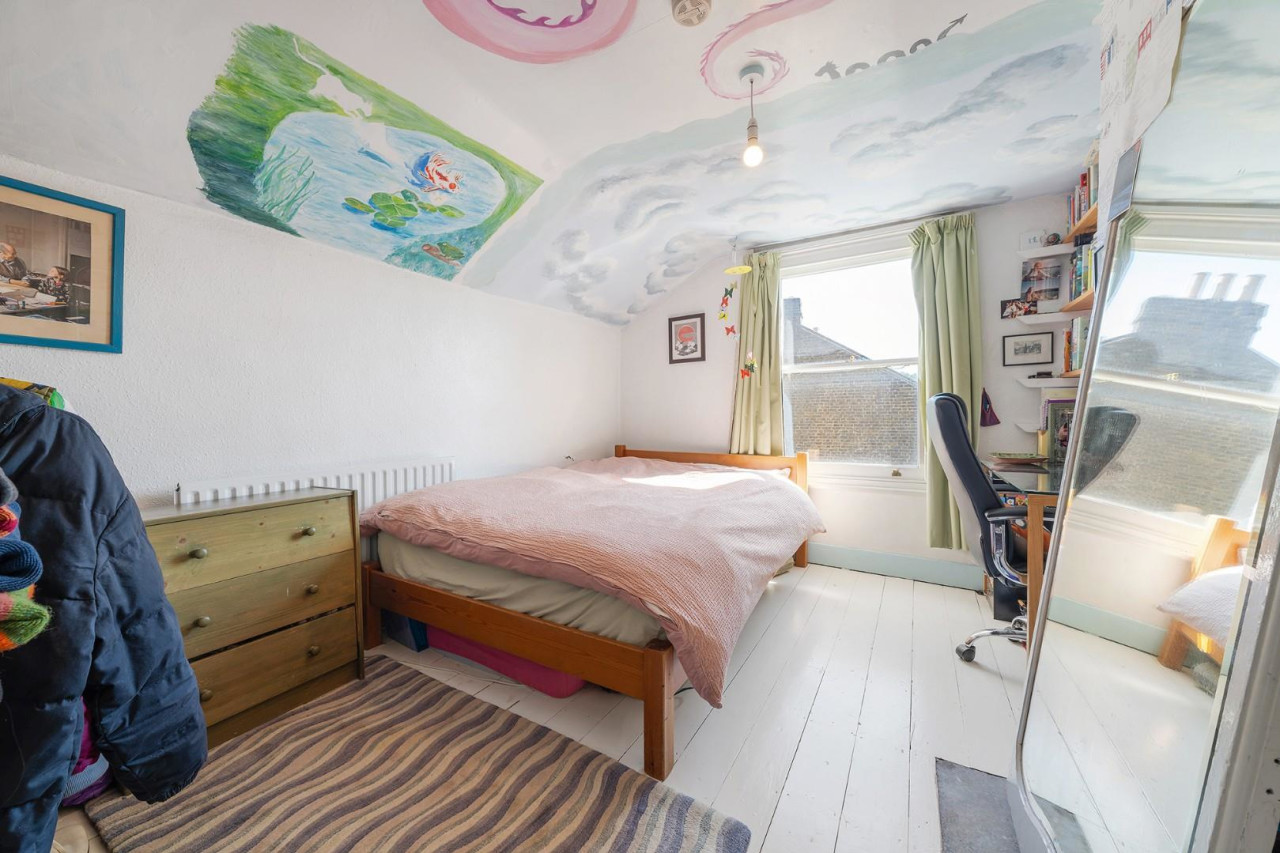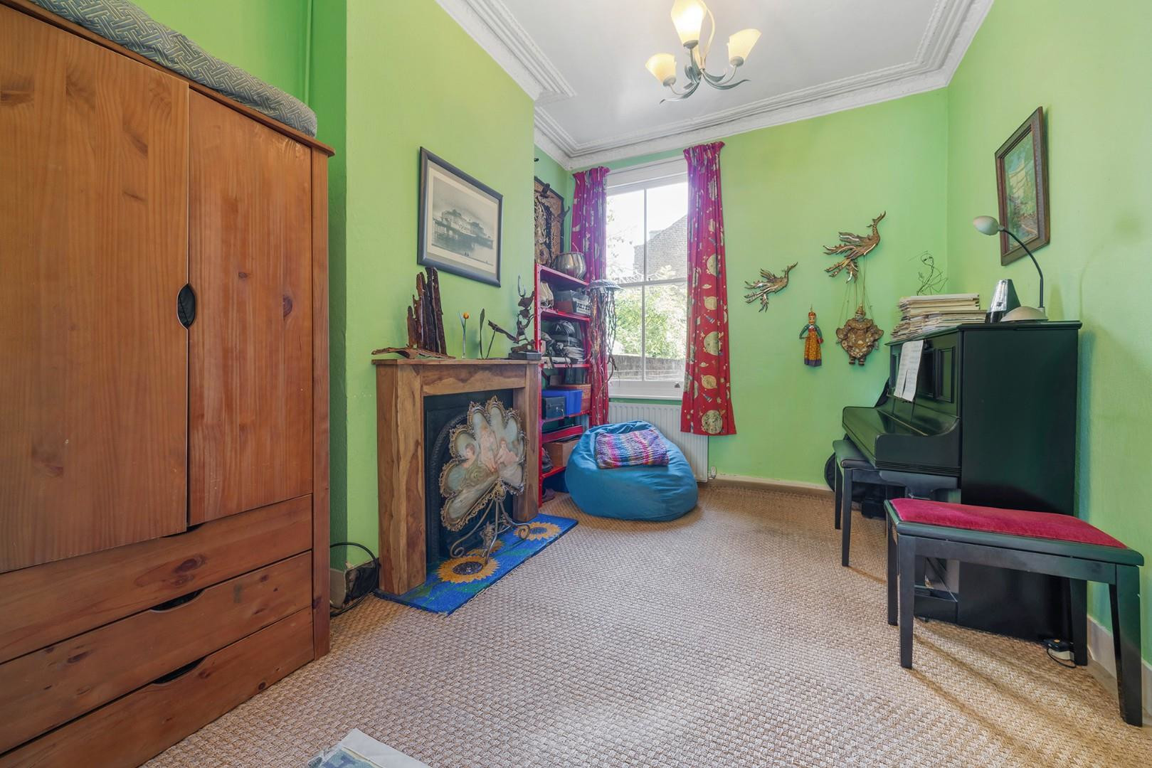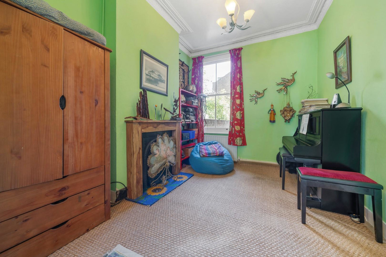 The second largest bedroom spans the width of the first floor, showcasing a wall of fitted wardrobes and shelving, as well as two striking arched sash windows which enhance the light and elegance of the room. The remaining three bedrooms are positioned to the rear of the property, each enjoying garden views and well-proportioned dimensions—ideal for children, guests, or working from home. A modern family bathroom and a separate third WC serve these rooms.