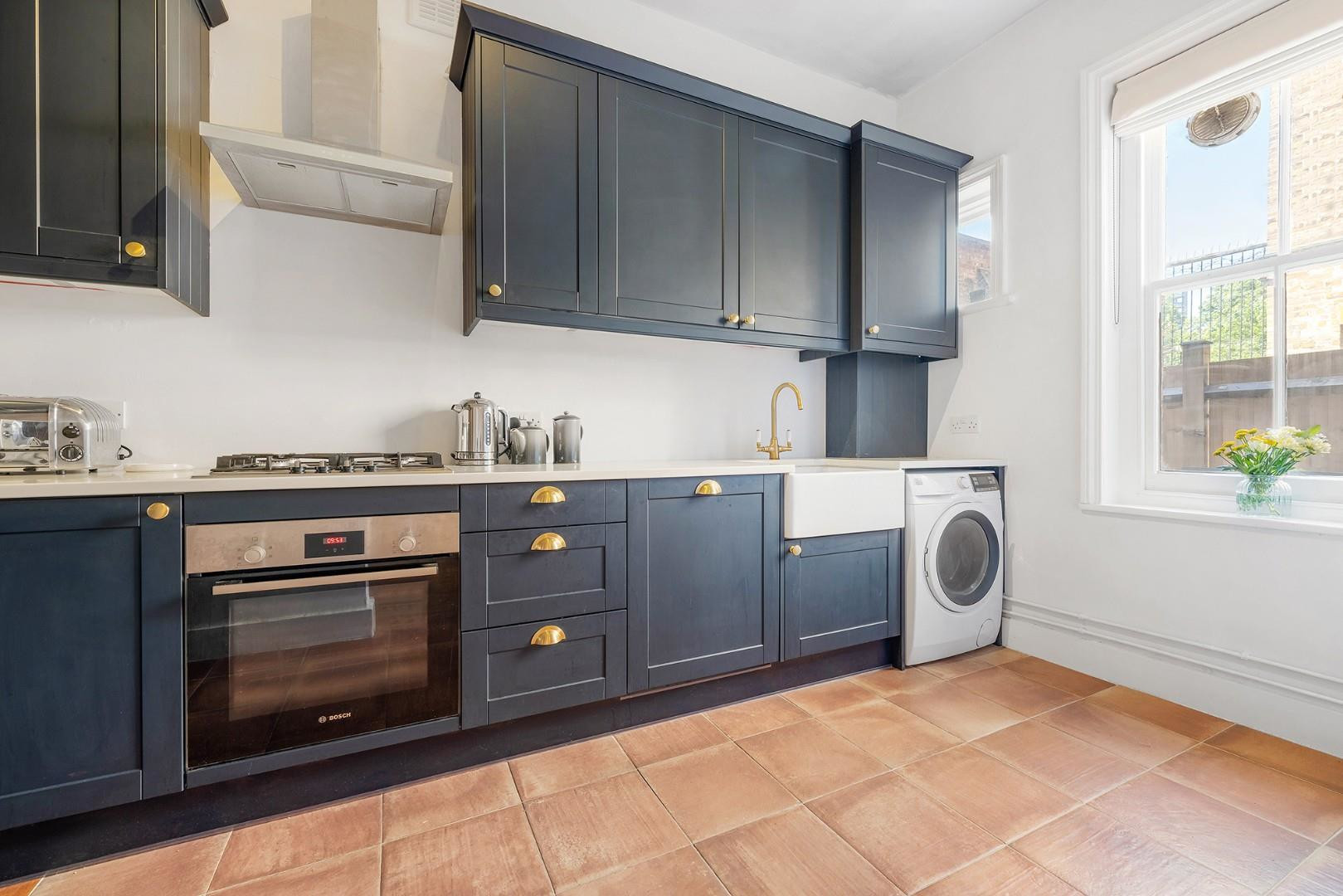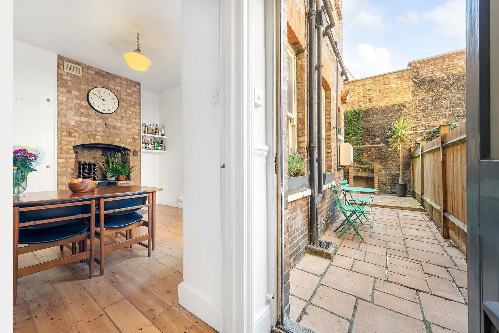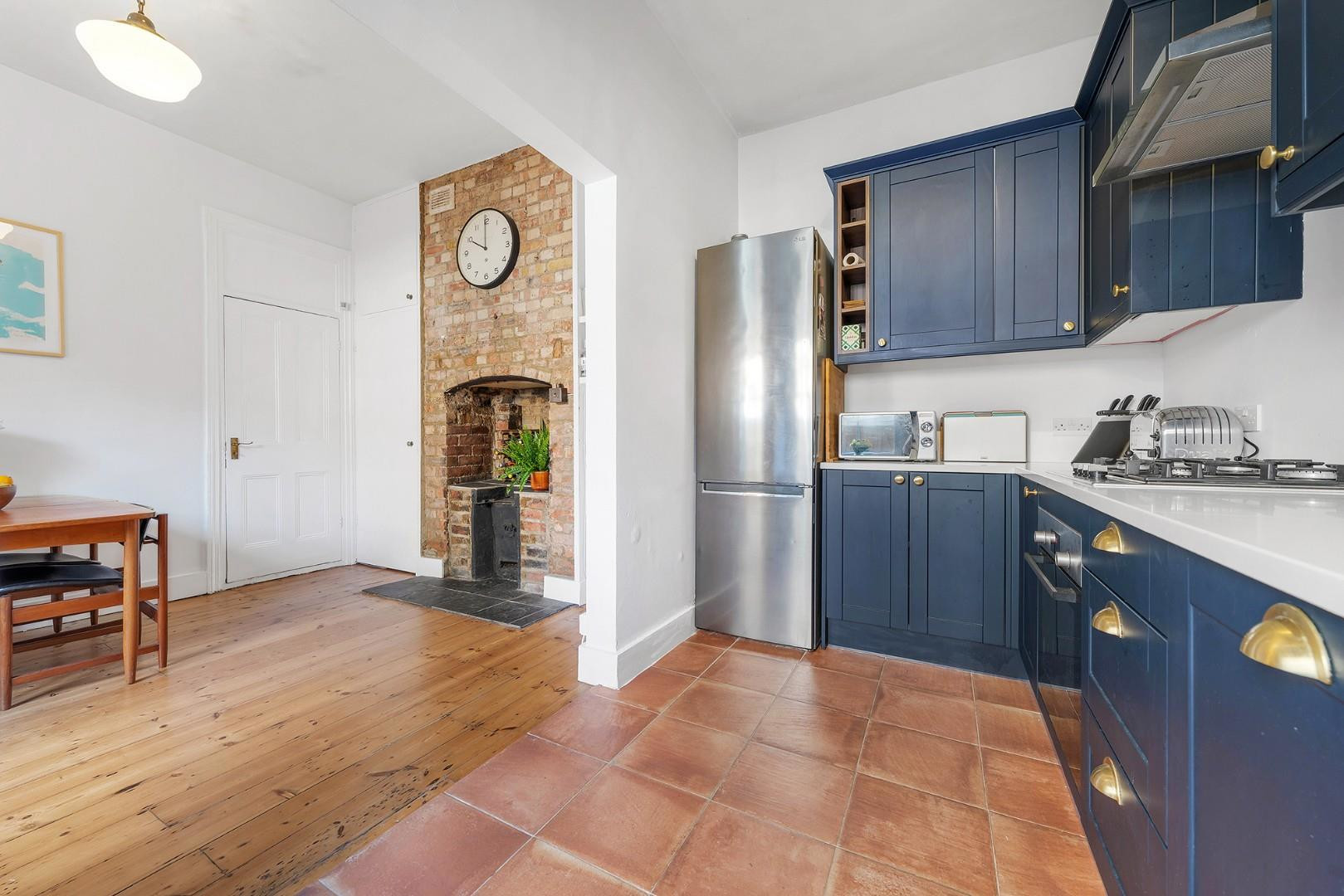 The heart of the home is the beautiful dining room—a sociable space, ideal for family meals or dinner parties—featuring a striking exposed brick chimney breast and a handy built-in storage cupboard. Flowing seamlessly into the semi-open-plan layout is the kitchen, refitted within the last three years. It boasts modern navy cabinetry with gold fittings, integrated appliances, and sleek white worktops. The layout is both stylish and practical, allowing for efficient meal preparation, while a charming sash window overlooking the garden provides excellent natural light and ventilation. For added peace of mind, the boiler—discreetly housed in the kitchen—was also newly installed within the same timeframe.