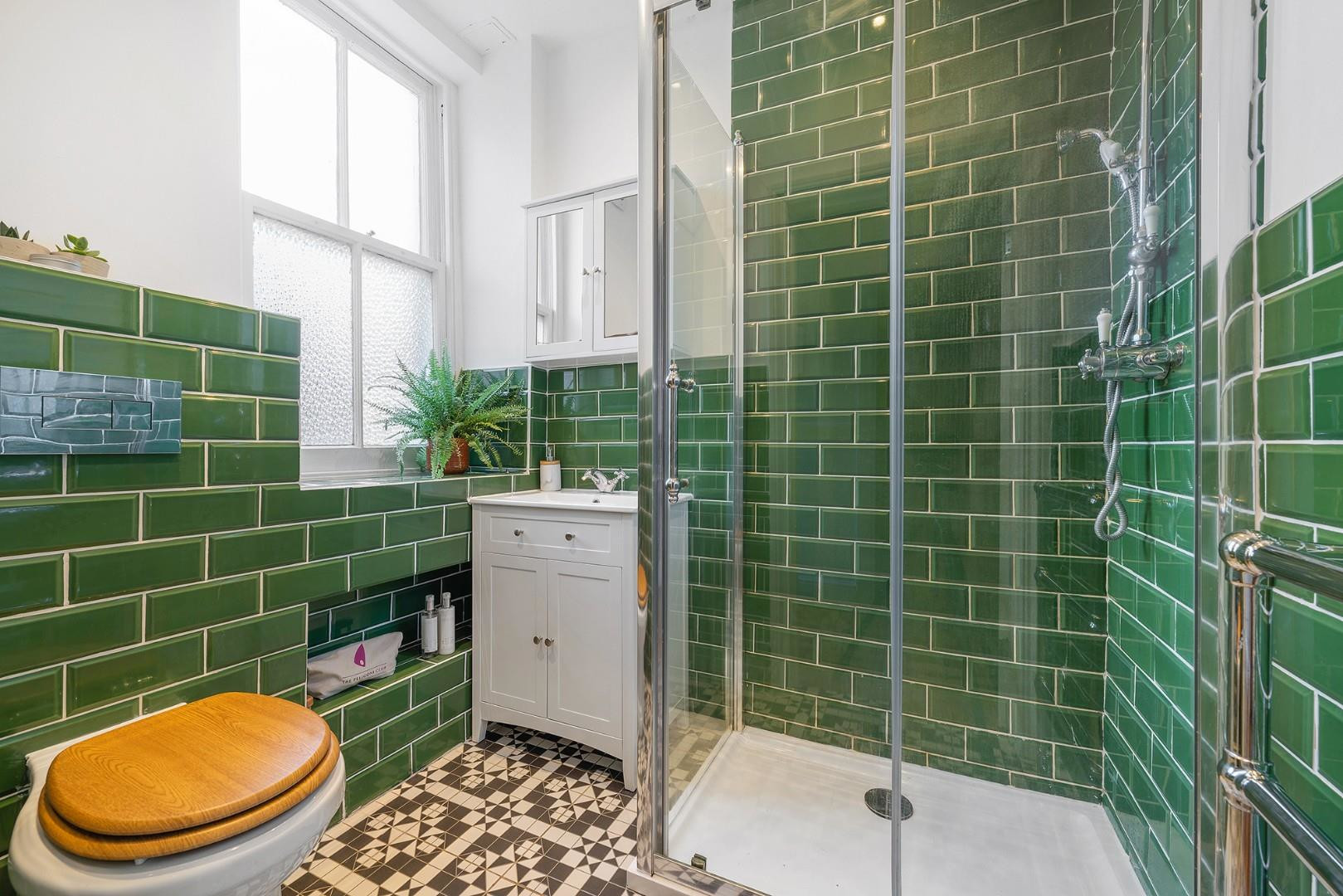 Opposite is the stylish family bathroom, thoughtfully positioned for visiting guests. Recently renovated within the last three years, it is smartly presented with striking green subway tiles and a walk-in shower, offering both visual appeal and practical functionality.