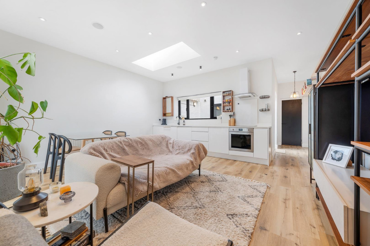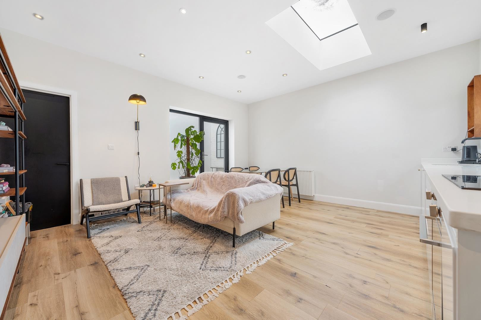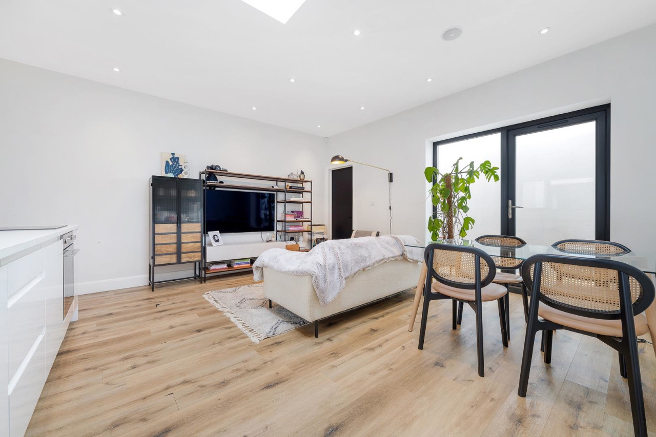 The open-plan kitchen and reception room forms the heart of the home. Set beneath a striking skylight, the space is bathed in natural light, with a large window overlooking the central courtyard that enhances the warm, inviting atmosphere. The tasteful neutral décor, sleek flooring, and thoughtful lighting design create a welcoming ambiance, while the contemporary kitchen is fully integrated with modern appliances, matt white cabinetry, and crisp white worktops. There’s ample space for both lounging and dining, making it a perfect area for entertaining or simply relaxing in comfort.
