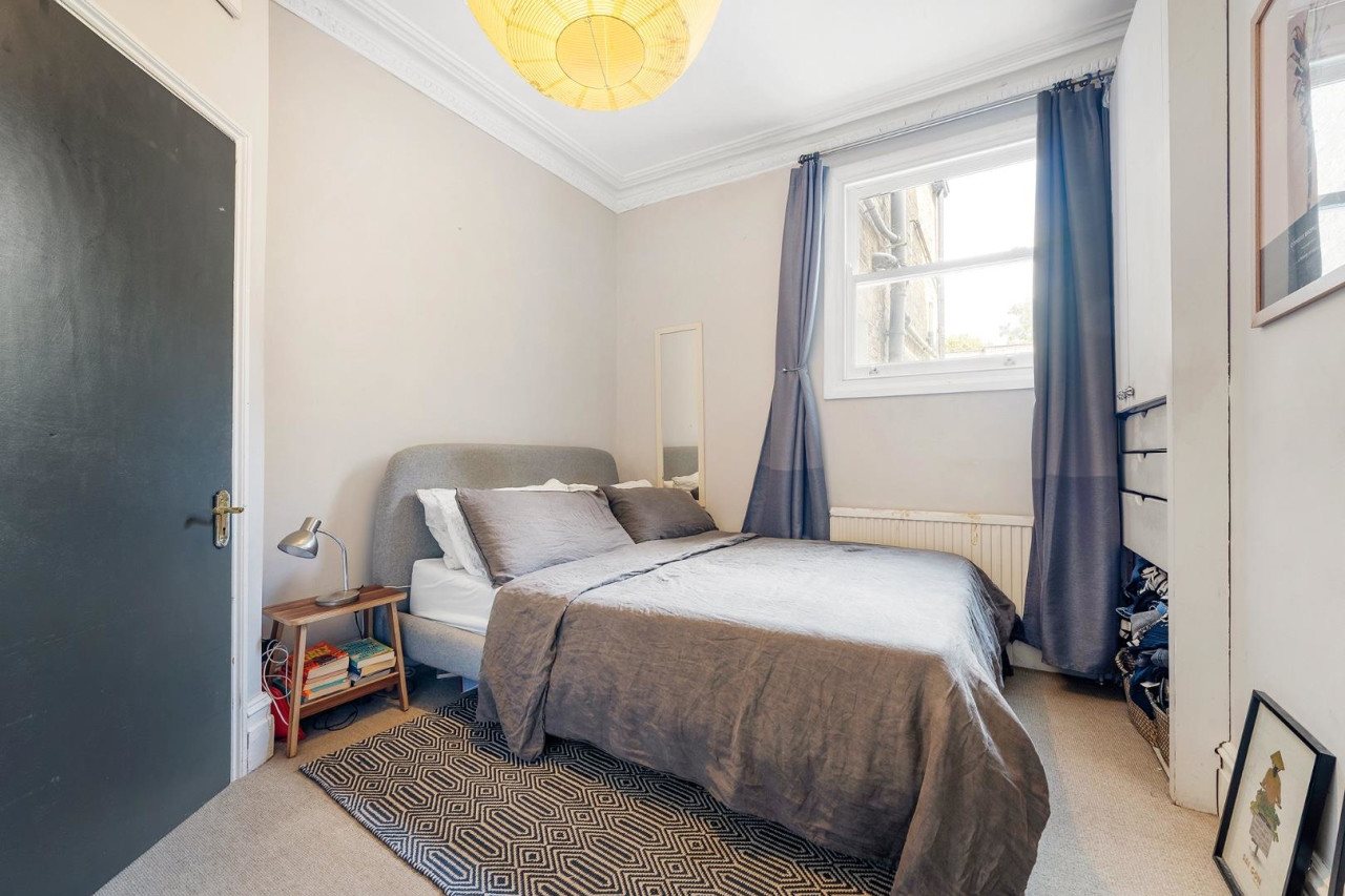 Stepping into the flat, you are welcomed by a bright and inviting reception room positioned at the front of the property. Bursting with character, the reception room retains beautiful original cornicing and an elegant ceiling rose, with exposed floorboards adding warmth. A feature fireplace forms the focal point of the room, framed by bespoke shelving and cabinetry built into the alcoves, offering both style and practical storage. The bay window is fitted with chic café-style shutters, allowing you to adjust the light and privacy while maintaining the room’s period charm. A warm and characterful space, perfect for unwinding or entertaining friends in a relaxed setting.
