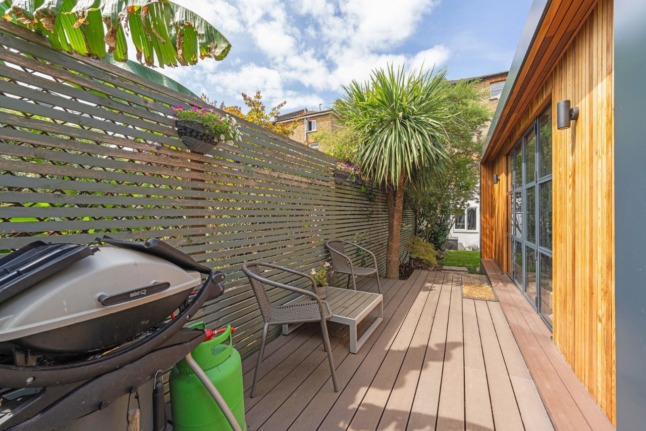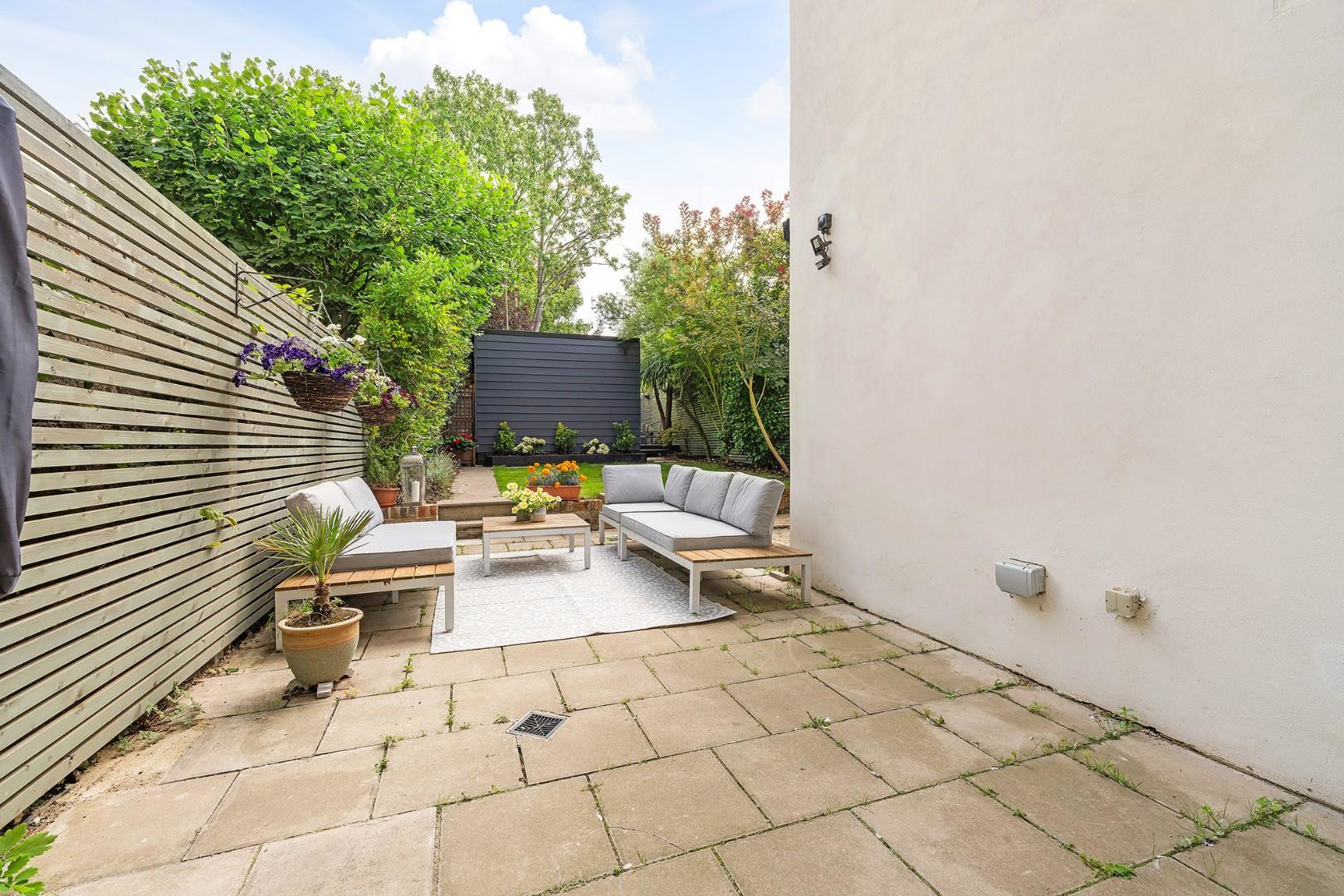 Beautifully landscaped, the South-East facing garden is a sunny oasis, with a charming patio area ideal for al fresco dining, leading via a few steps to a lush lawn bordered by mature shrubs that provide both privacy and a leafy backdrop. A truly relaxing space perfect for hosting, with gated side access adding to the ease of hosting whilst also making it perfect for families with prams or those with bicycles.