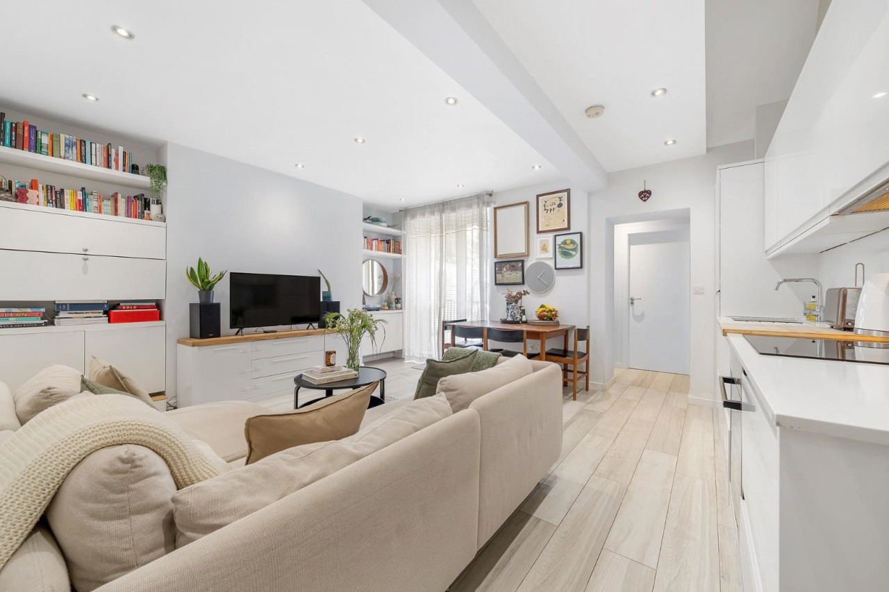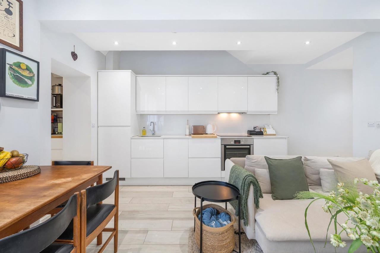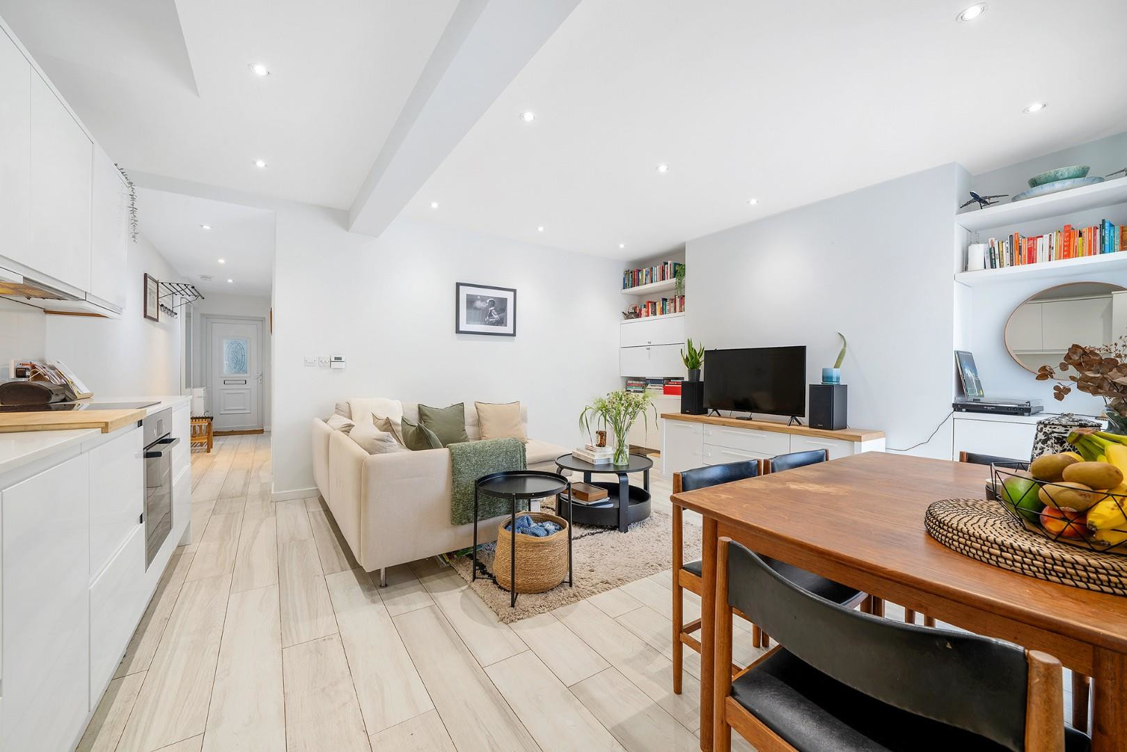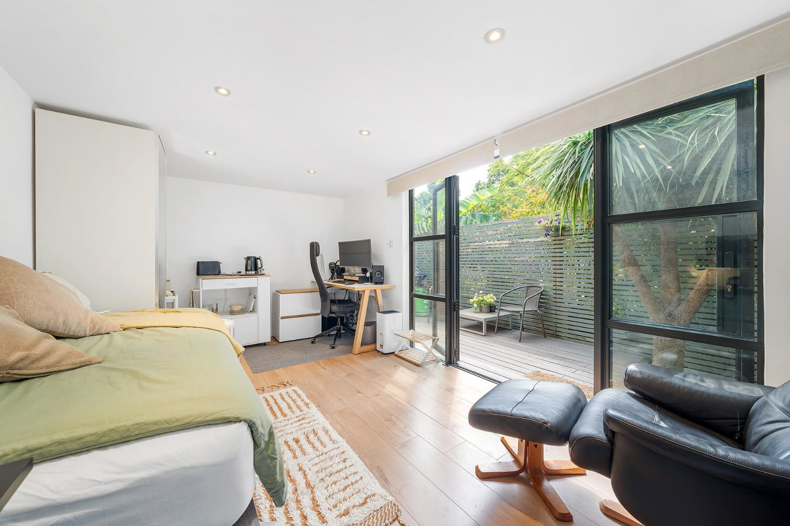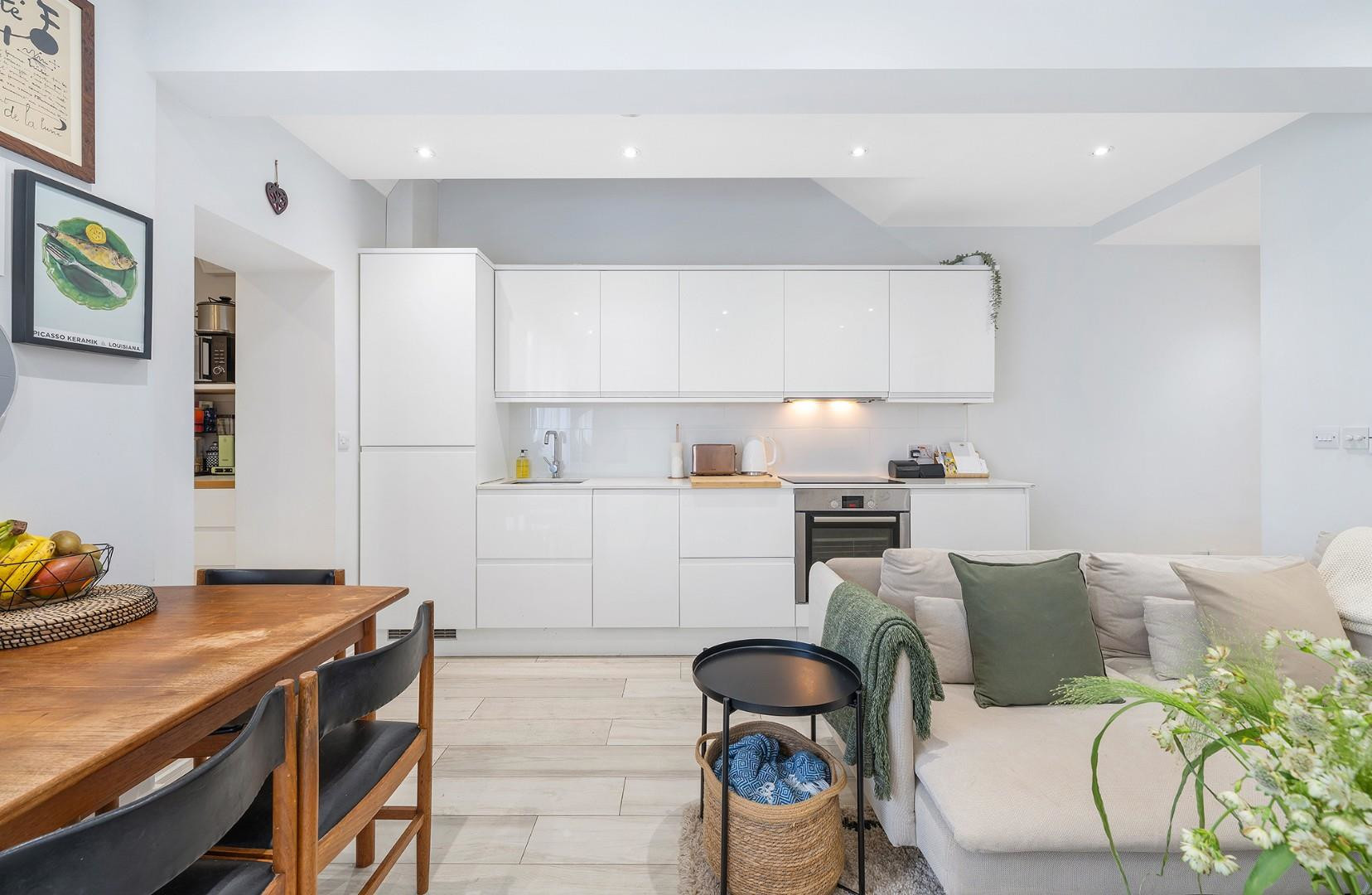 Accessed via a private entrance, the flat opens into an inviting hallway with contemporary flooring sweeping though into the open plan reception room at the rear of the home. With modern downlighting, underfloor heating and a clean decorative aesthetic this spacious and sociable room offers ample space to cook, dine, lounge and entertain. Neatly set to one side, the kitchen boasts ample storage and integrated appliances within sleek, gloss cabinetry which bounces light around the room. A separate utility room sits adjacent, liberating space in the kitchen and keeping the laundry tucked out of view. The comfortable lounge area boasts generous shelving and storage, ideal for curling up with a book, whilst there is still plenty of space for a generous dining table, perfect for both relaxing evenings and lively gatherings. French doors allow summer air to breeze through the room, leading to the private garden.