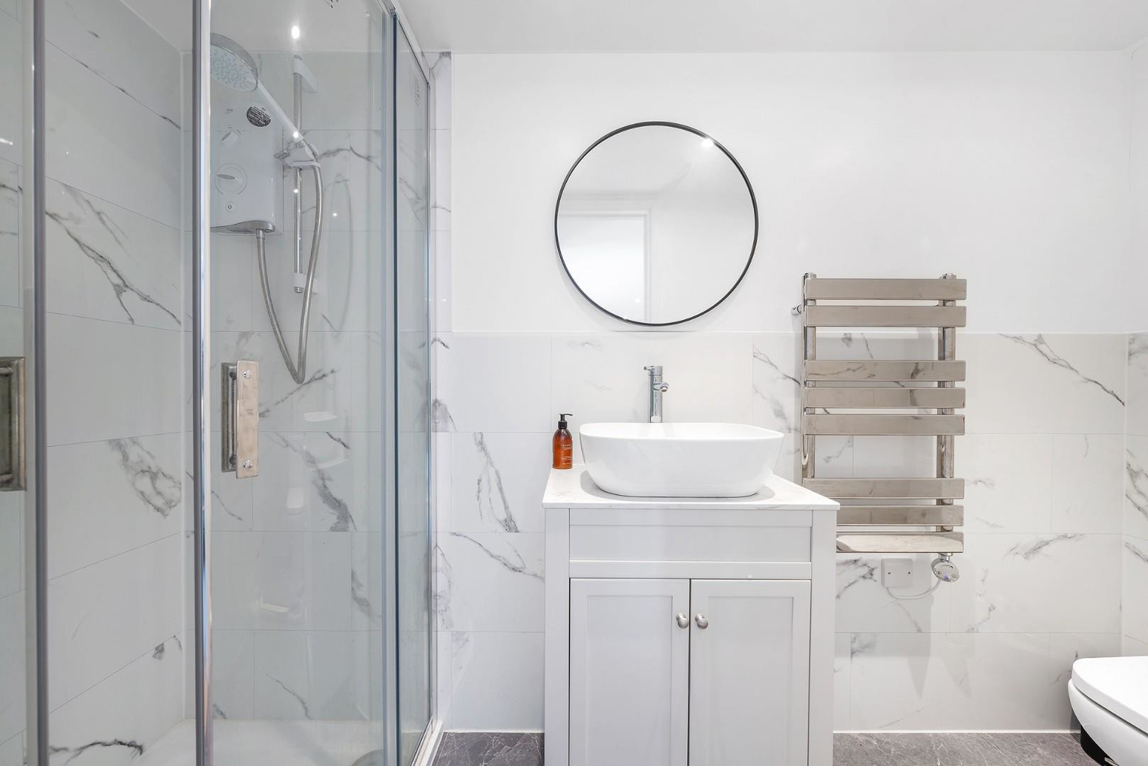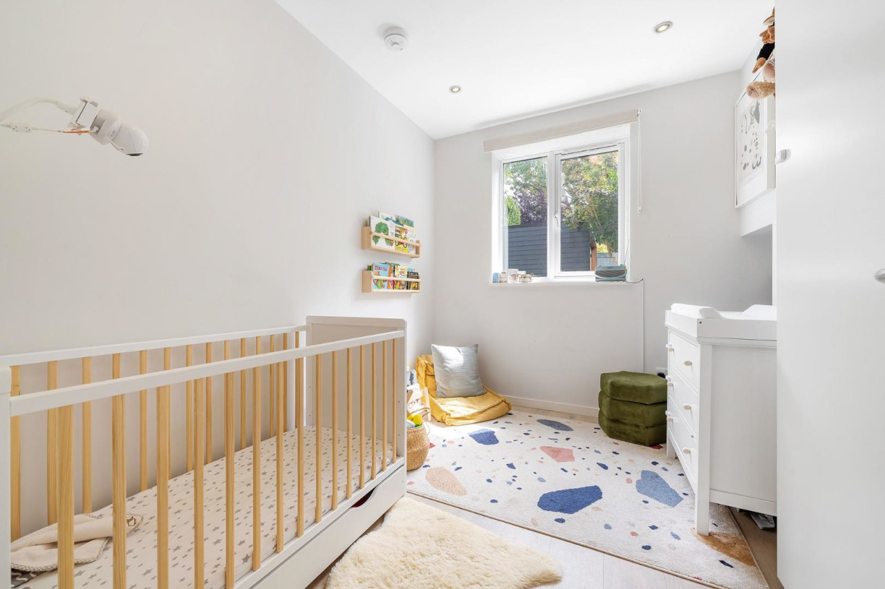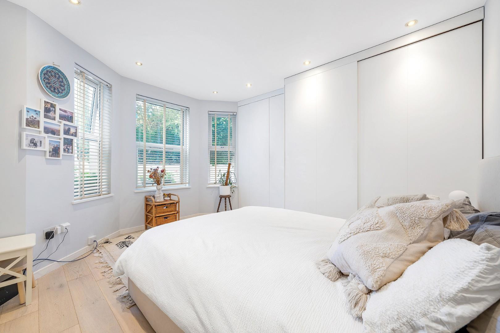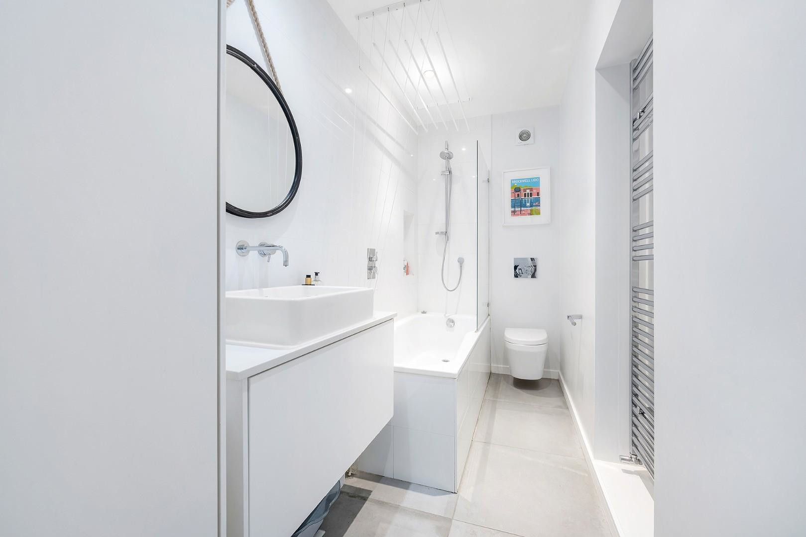 Back inside the main apartment, both bedrooms enjoy complete privacy from one another. The principal bedroom is nestled behind a large bay window, boasting generous proportions and a wall of neatly fitted wardrobes with a soothing ambiance. The second bedroom is the rearmost room in the apartment, overlooking the garden. This versatile room is currently an attractive nursery, yet has space to accommodate a double bed, or be repurposed into a tranquil home office. Centrally located within the home, the stylish bathroom is finished in crisp white tiling and is equipped with a bathtub and overhead shower, complete with under sink storage, a large heated towel rail and even a Sheila Maid above the tub. Additional storage is found in an understairs cupboard beside the private entrance.