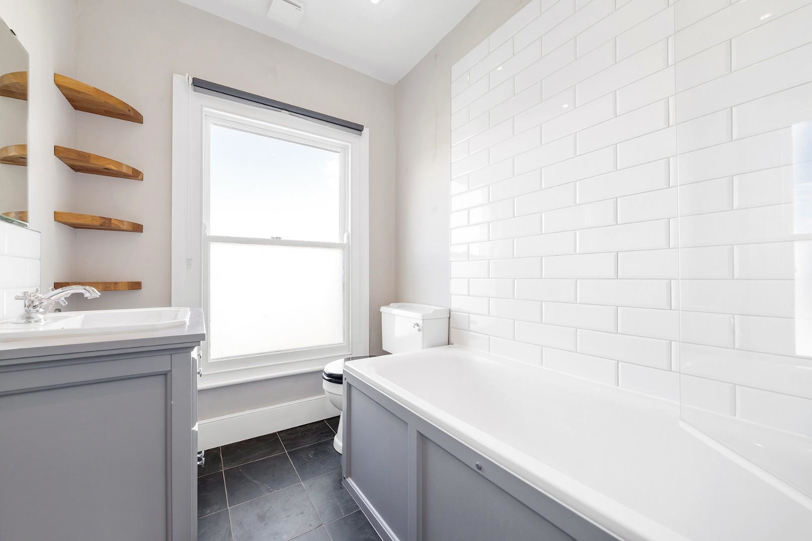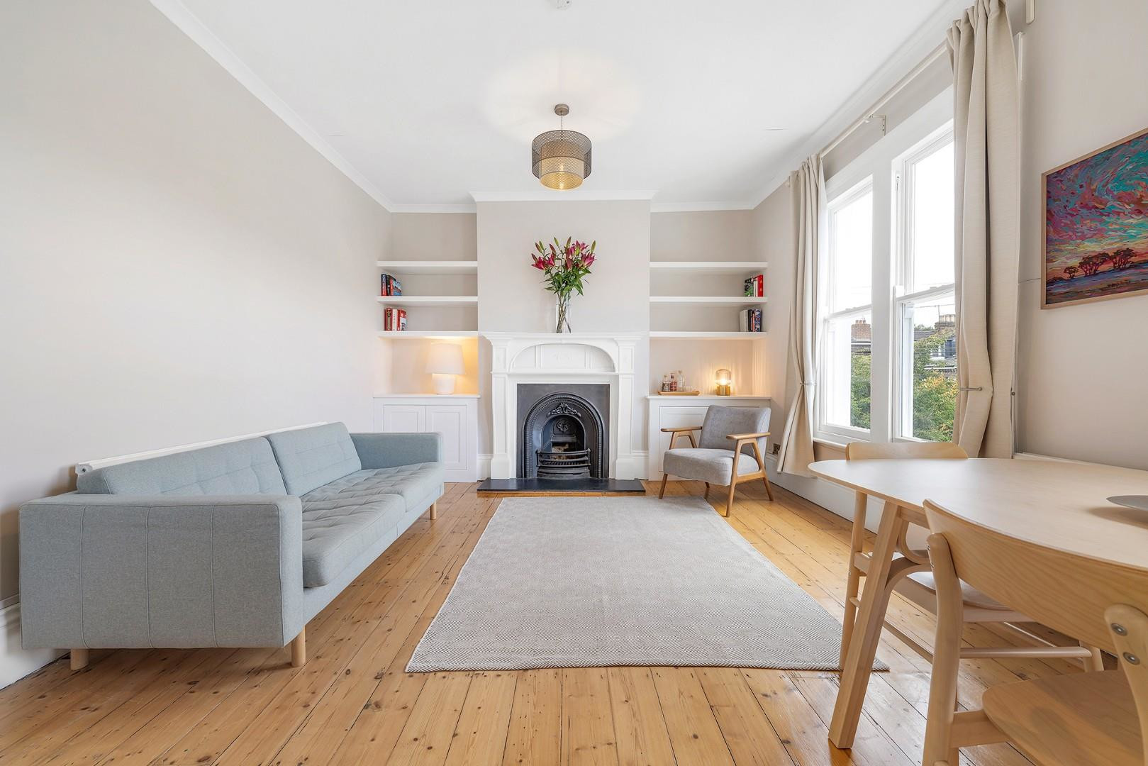 With nearly 1,000 square feet of internal space, this characterful period conversion offers bright, airy living and has been repainted this year. The reception room is particularly impressive, set to the front of the home and bathed in natural light from large sash windows that frame views over the pretty residential street below. High ceilings and original wooden floorboards create a sense of grandeur, while the ornate feature fireplace with decorative mantel provides a charming focal point, flanked by fitted shelving and storage. With proportions that comfortably accommodate both lounge and dining areas, this room is perfect for entertaining or relaxing alike.