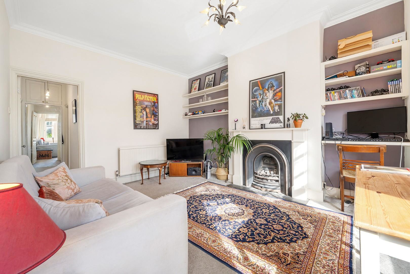 The heart of the home is the semi-open-plan reception and kitchen, a sociable space for both relaxing and entertaining. A beautiful bay with sash windows bathes the room in natural light, complemented by a window seat. The lounge area is enhanced by a decorative fireplace as the focal point, with shelving within the alcoves. A doorway leads through to the kitchen, where the layout allows for efficient meal preparation, while a charming sash window brings in excellent light and ventilation. The kitchen’s arrangement is both practical and stylish, offering ample worktop space and storage for all your culinary needs.