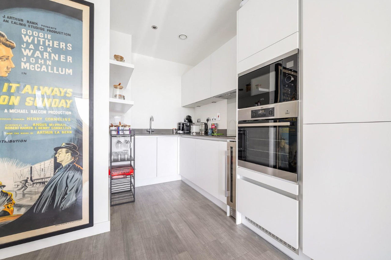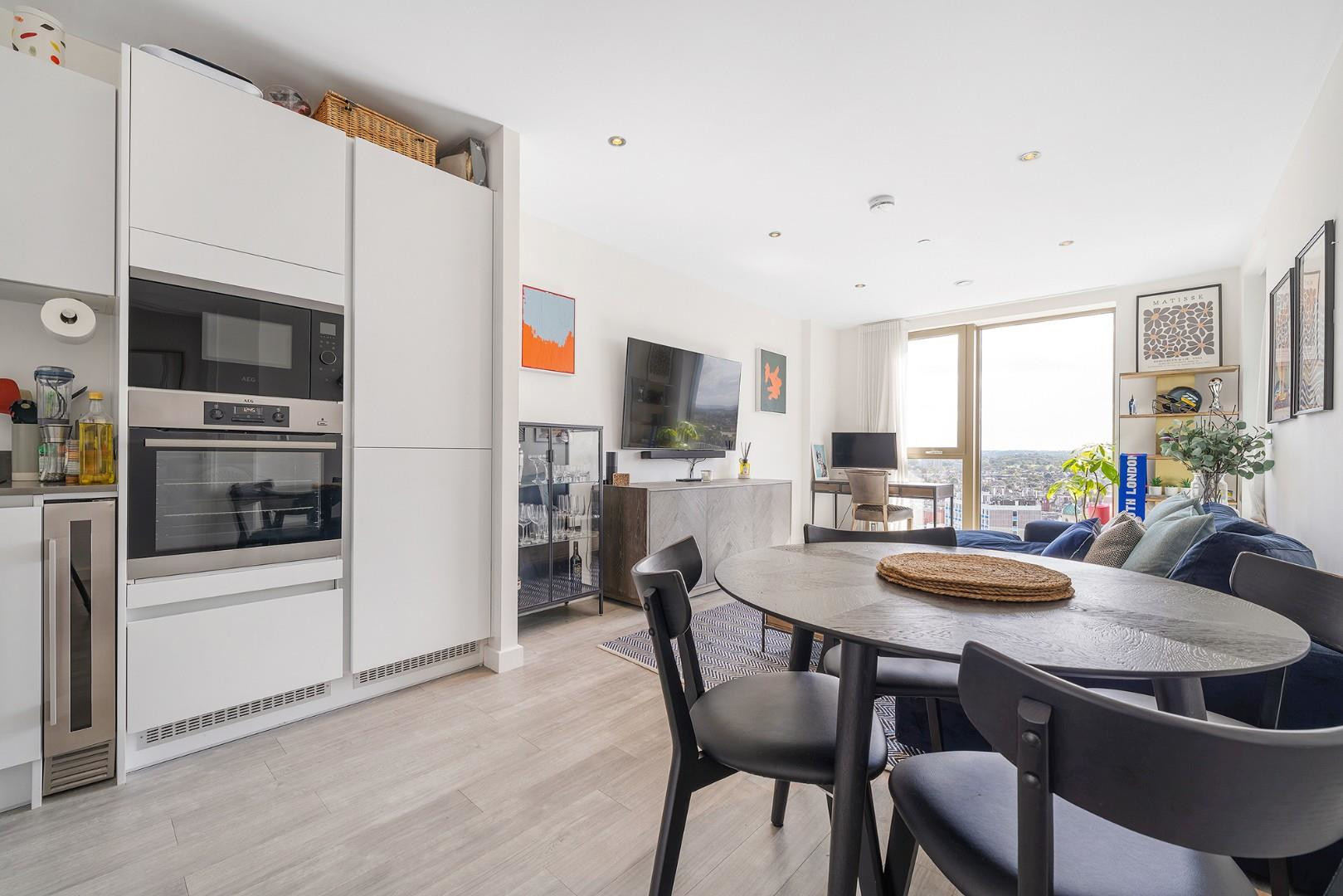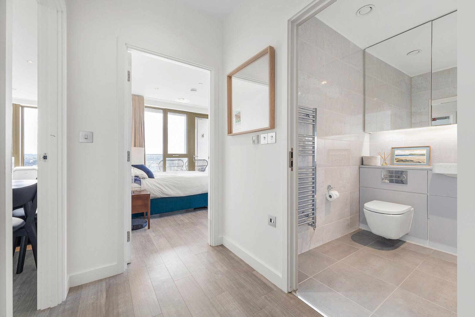 At the heart of the home is the generous open-plan reception, a stylish, welcoming space ideal for relaxing or entertaining. Full-height windows frame far-reaching views across the London skyline and flood the room with natural light, while the adjoining South-East facing terrace offers a peaceful outdoor retreat, perfect for morning coffee or evening aperitifs. The living area comfortably accommodates both lounge and dining zones, and the sleek kitchen features white cabinetry with integrated appliances, including a microwave, dishwasher, and wine cooler. A utility cupboard in the hallway provides additional storage and keeps laundry neatly tucked away.