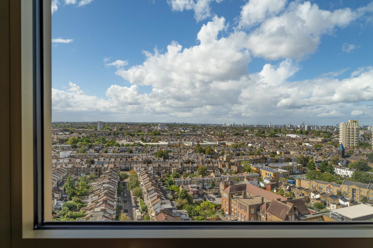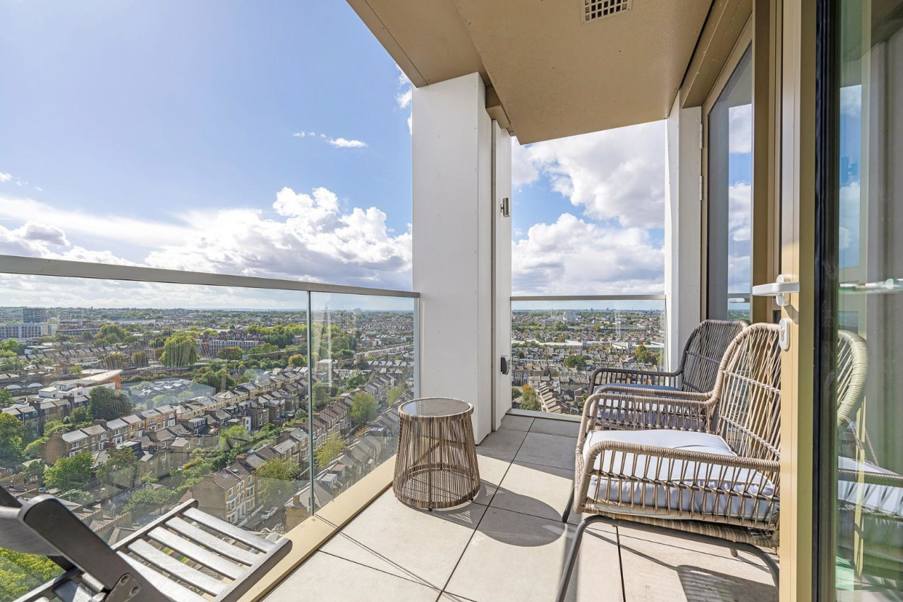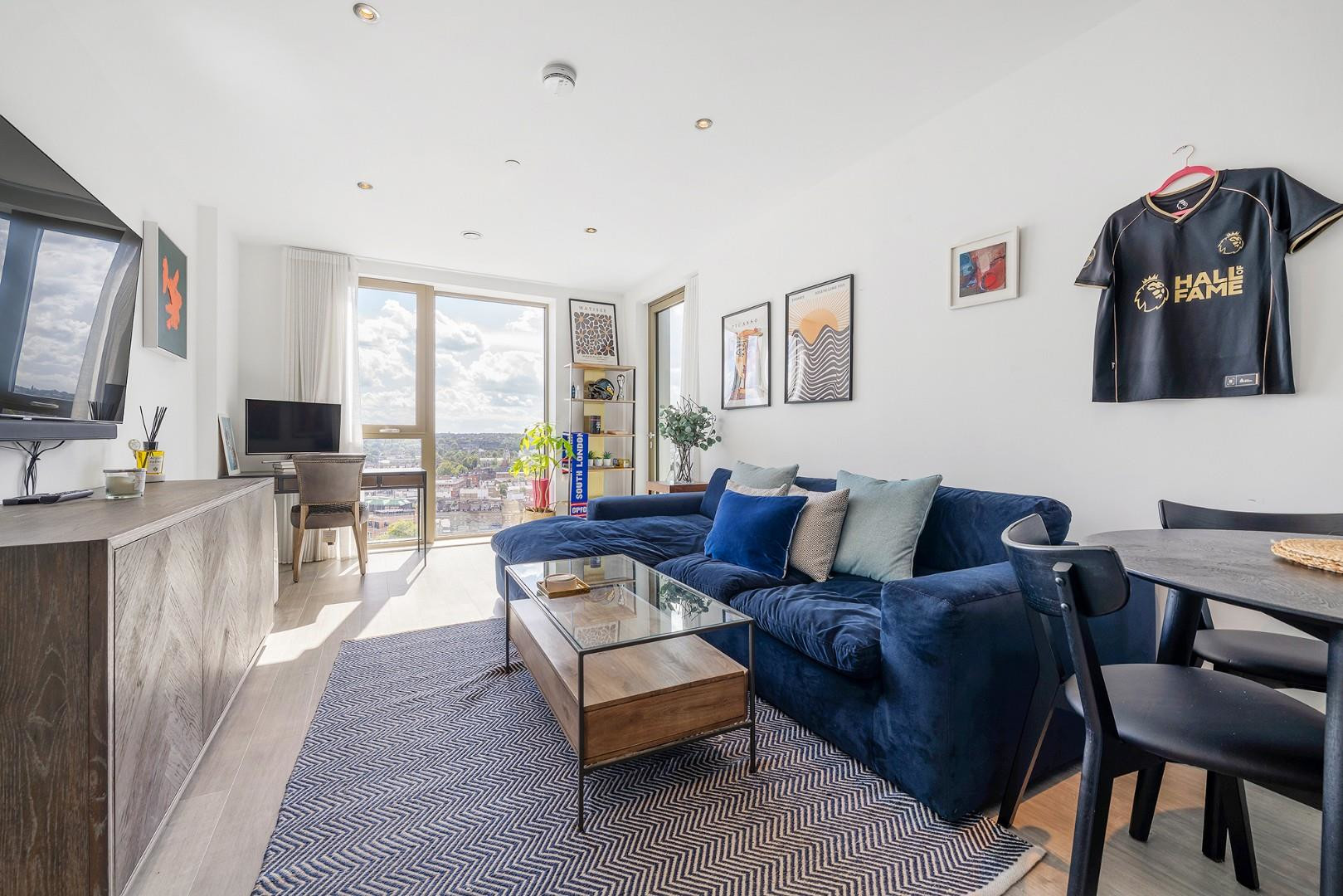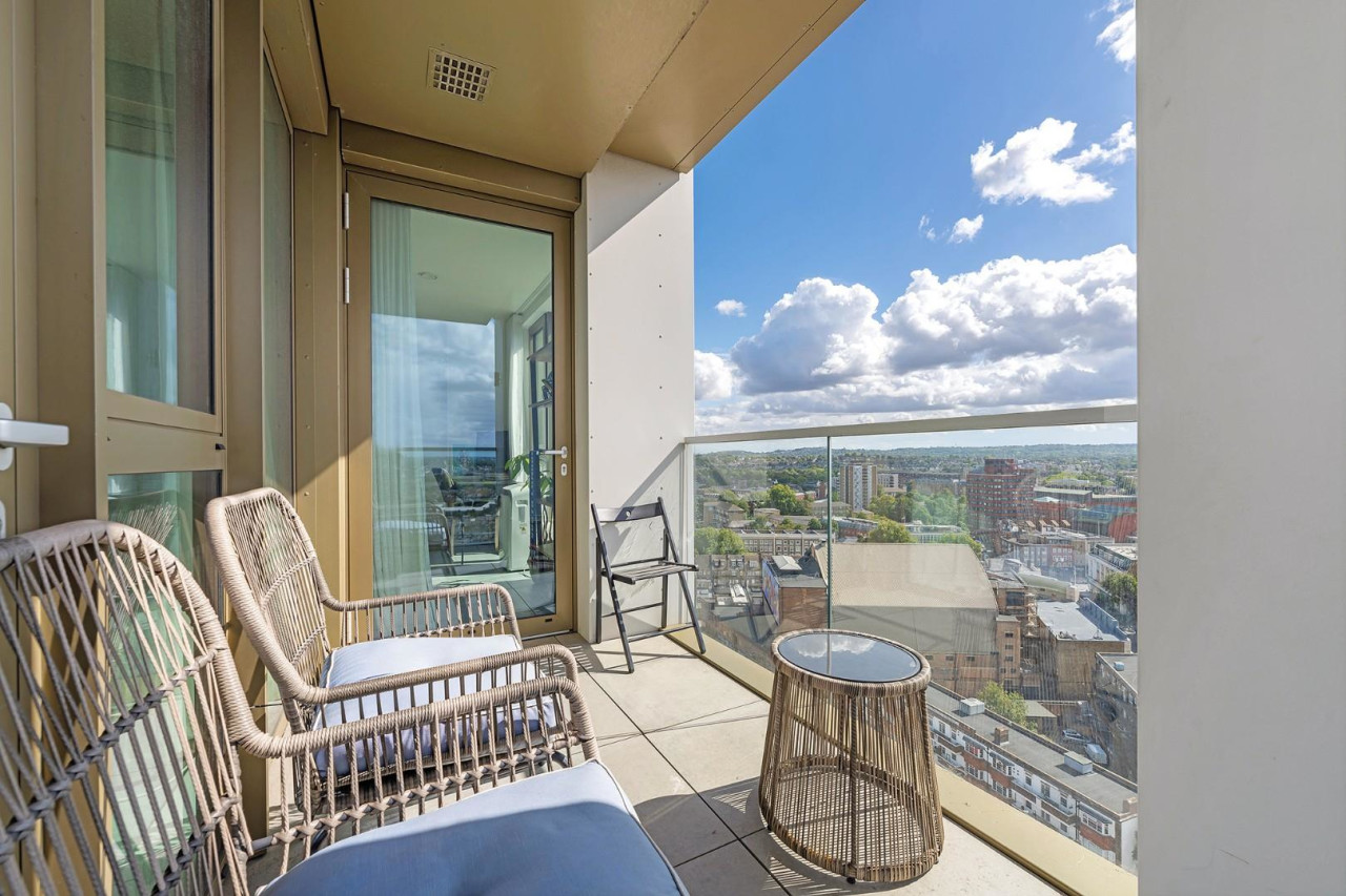 At the heart of the home is the generous open-plan reception, a stylish, welcoming space ideal for relaxing or entertaining. Full-height windows frame far-reaching views across the London skyline and flood the room with natural light, while the adjoining South-East facing terrace offers a peaceful outdoor retreat, perfect for morning coffee or evening aperitifs. The living area comfortably accommodates both lounge and dining zones, and the sleek kitchen features white cabinetry with integrated appliances, including a microwave, dishwasher, and wine cooler. A utility cupboard in the hallway provides additional storage and keeps laundry neatly tucked away.