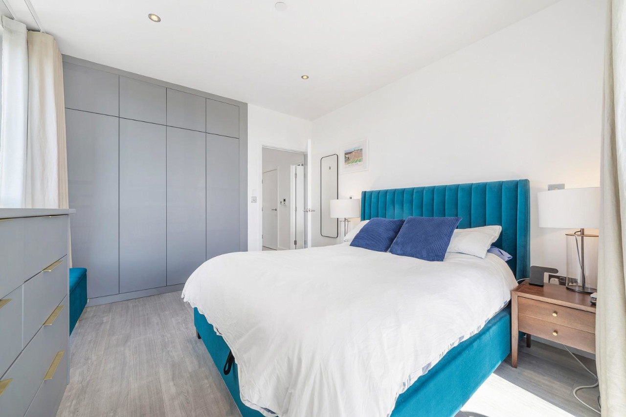The well-proportioned double bedroom is a serene retreat with a double aspect outlook, neutrally decorated and complete with custom made built-in wardrobes. There's ample space for traditional bedroom furnishings, plus a desk or dressing table if desired. It also offers direct access to the sunny terrace.