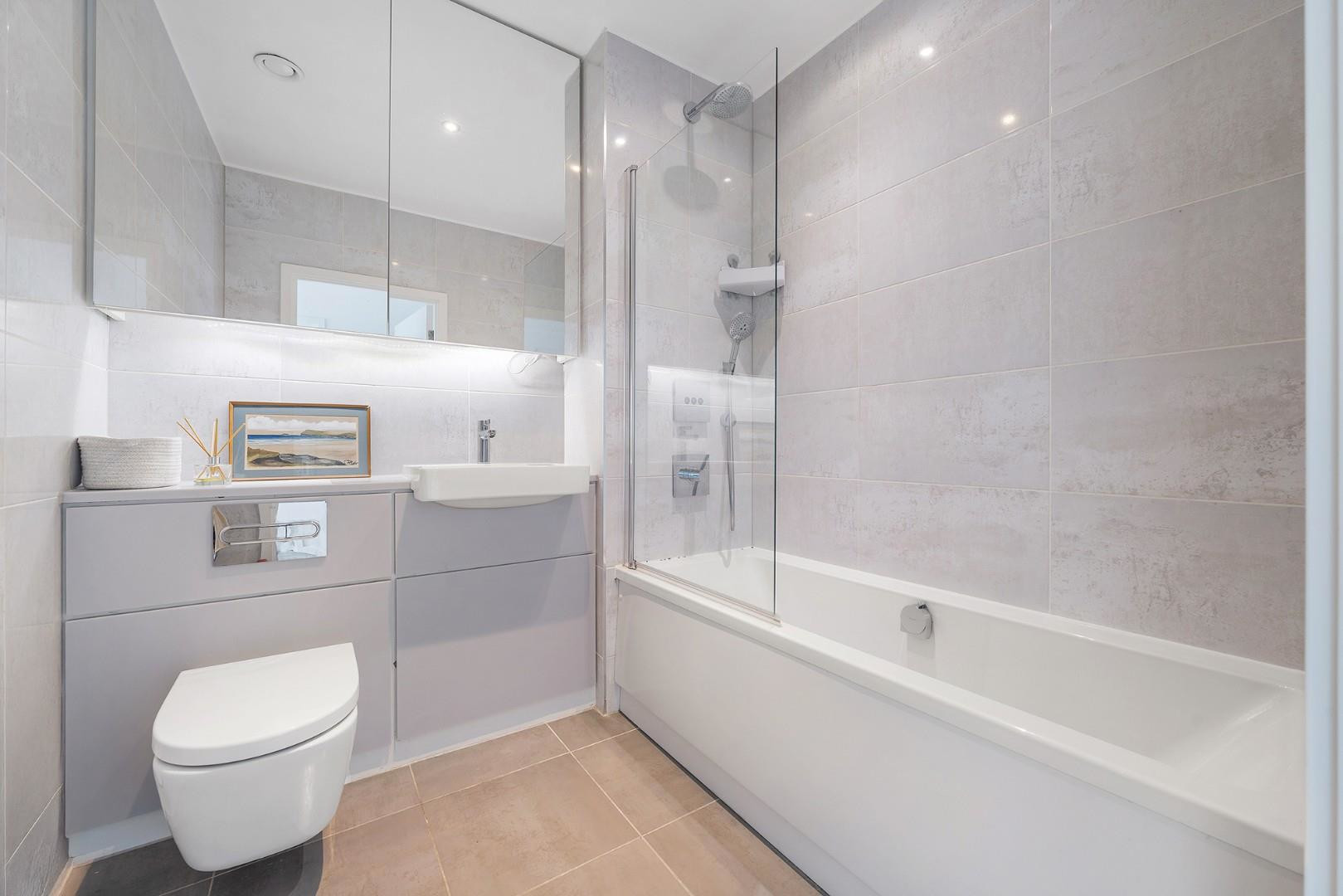 A stylish, fully tiled bathroom completes the interior, finished to a high standard with a luxurious double-ended bath, overhead rain shower, and mirrored storage.
