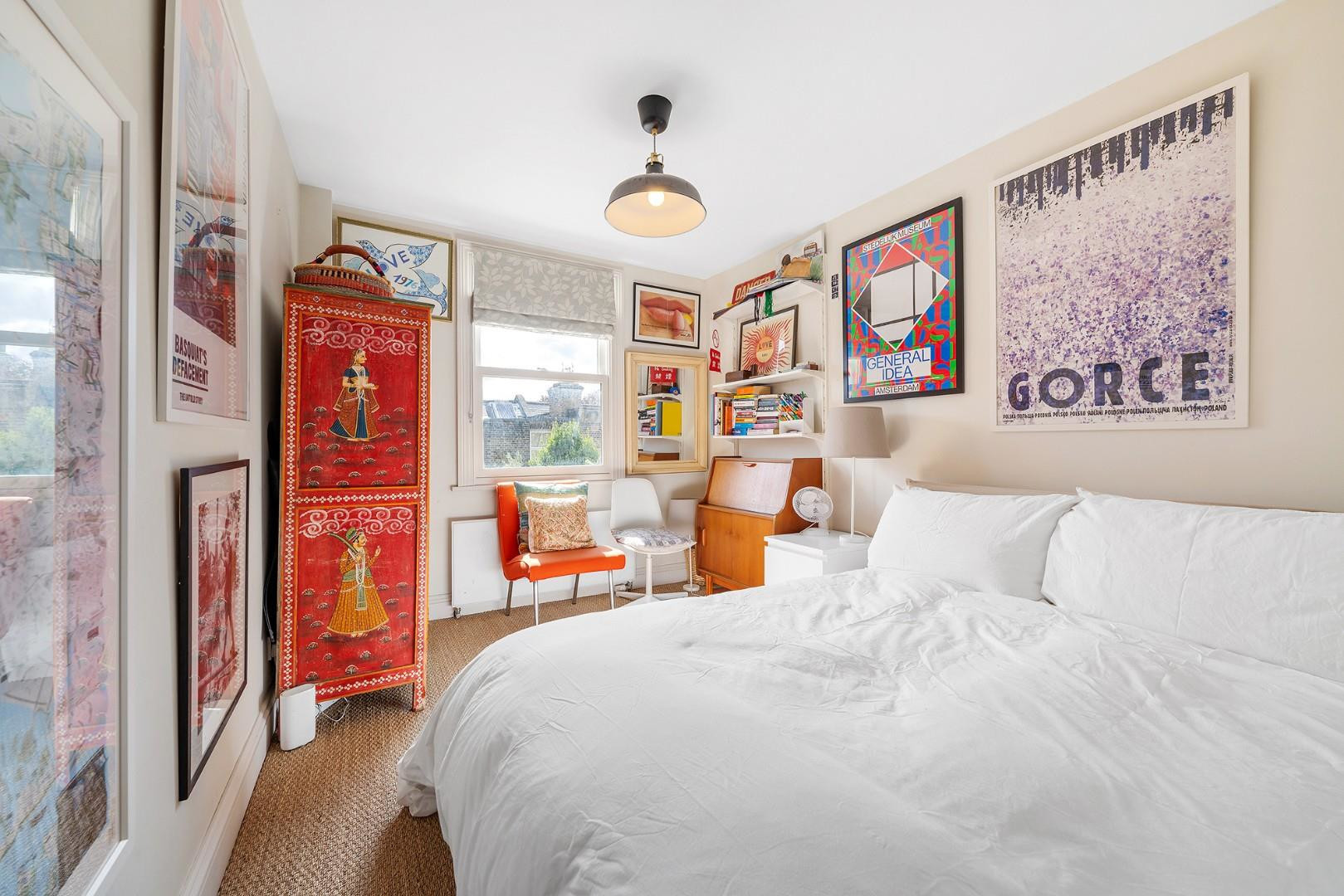 On the floor below, three genuine double bedrooms await—another exceptionally rare find within a Victorian conversion. The principal bedroom is particularly impressive, stretching across the full width of the property. Tastefully decorated in calming tones, with bespoke shelving and generous proportions, this room is a serene retreat. The two further double bedrooms sit peacefully to the rear, both enjoying leafy outlooks, and lend themselves to multiple uses such as guest bedrooms, studios or home offices. Completing the accommodation is a stylish family bathroom with a crisp white finish, Moroccan tiled flooring, and a double-ended bathtub with overhead shower.