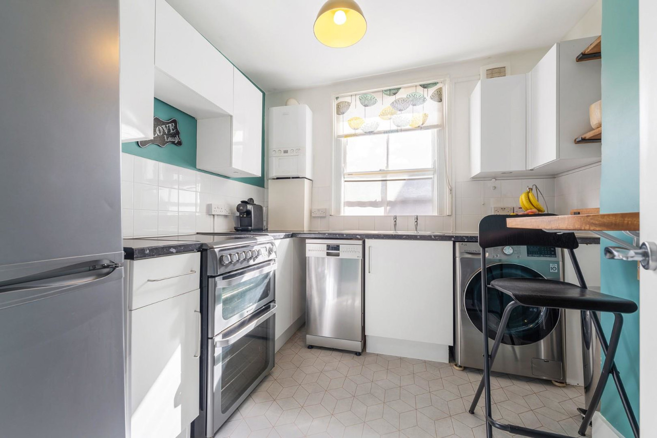 Positioned just off the landing is a separate kitchen, continuing the bright and airy theme. Crisp white cabinetry offers generous storage and a clean, timeless look, complemented by work surfaces with ample preparation space. A small breakfast bar creates a casual spot for morning coffee or informal meals, while a traditional sash window allows for natural ventilation and streams of daylight. The boiler is neatly housed here too, ensuring the kitchen remains uncluttered and practical.