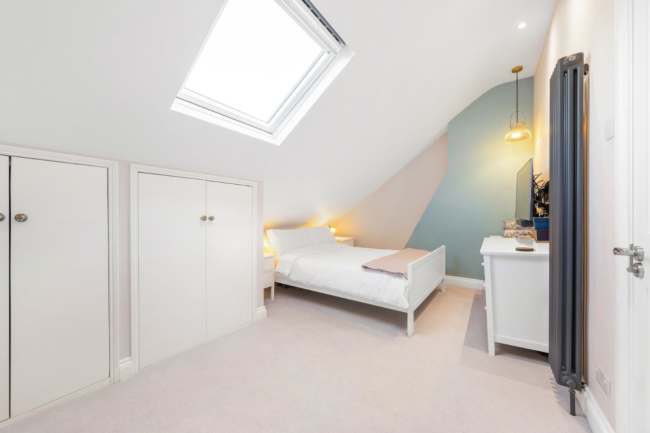 Stairs lead to the upper level where the principal bedroom and bathroom are privately positioned, offering excellent separation from the main living spaces, ideal for a peaceful night’s sleep. The principal bedroom is a generous and tranquil retreat, benefiting from a Velux window overhead that draws in natural light and sky views. Built-in wardrobes line one wall, offering excellent storage without encroaching on floor space, and a tall modern radiator adds a sleek, contemporary touch to the room’s clean lines.