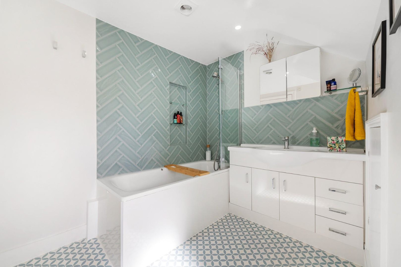 The bathroom is stylishly appointed, featuring a shower over the bath for both quick morning routines and leisurely soaks. A window brings in natural light and ventilation, while a contemporary basin with vanity unit provides storage and completes the room. A towel rail keeps linens warm, and clever storage in the eaves is great for hiding the lesser used items.