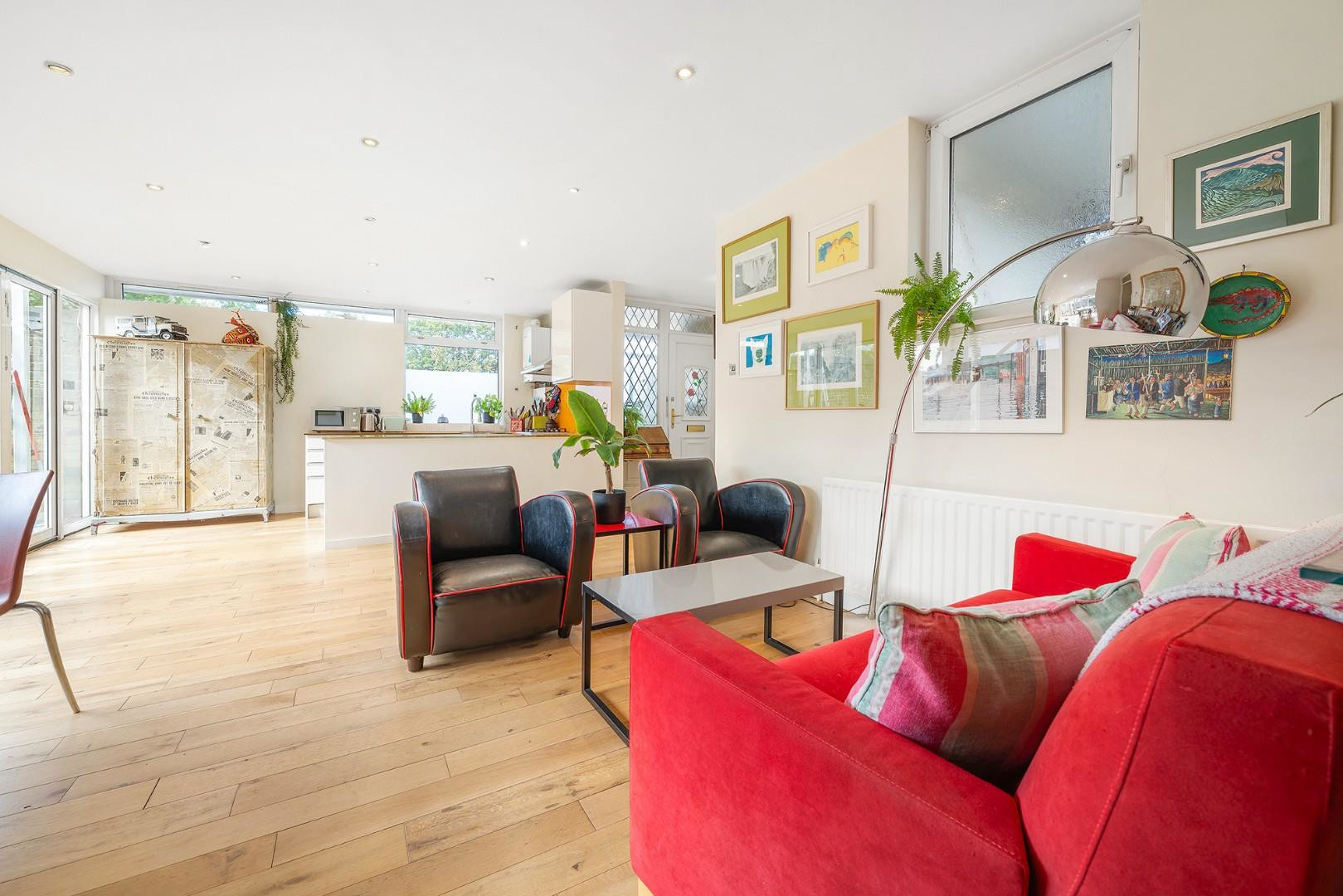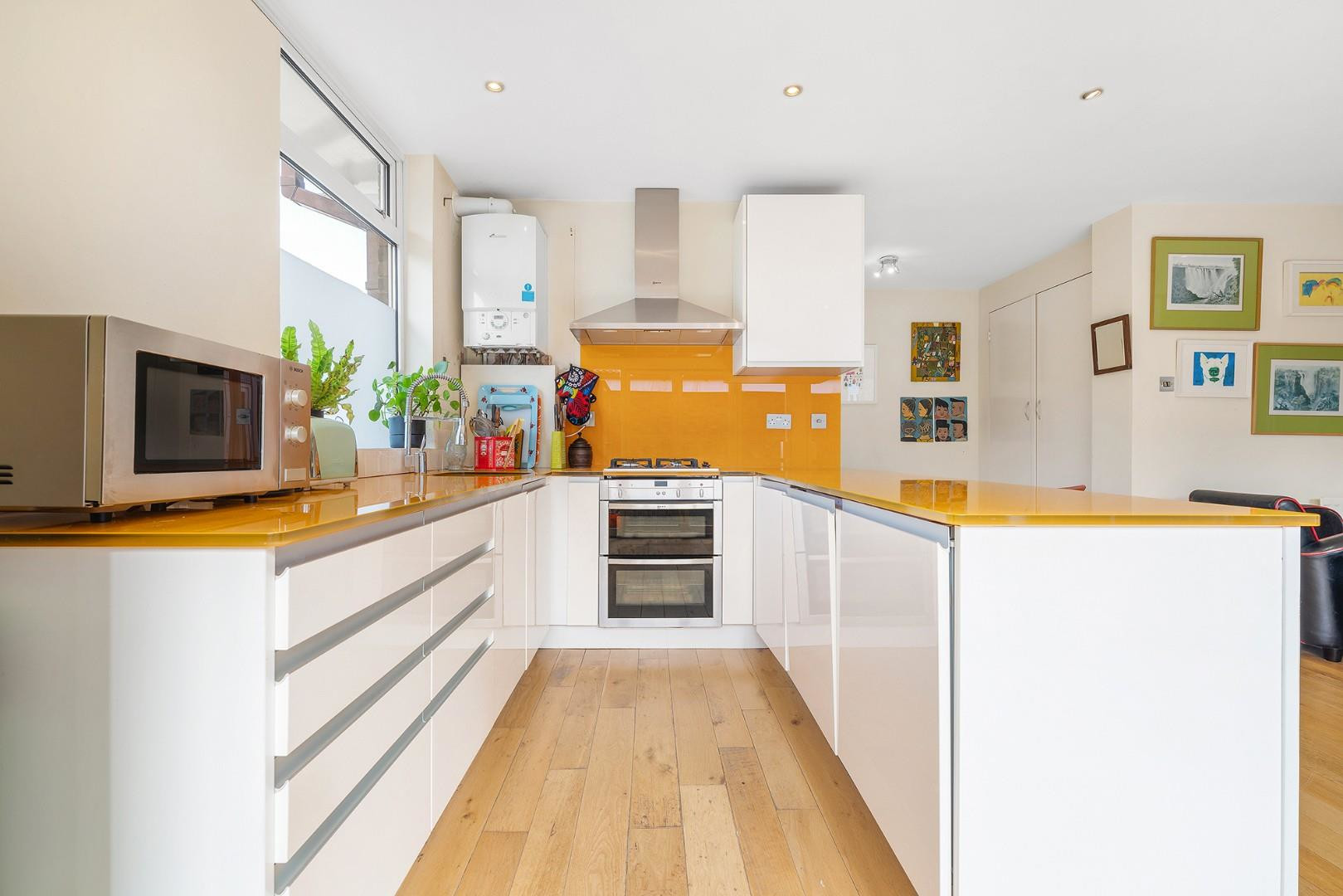 At the heart of the property is the expansive open-plan reception and kitchen/dining area. This bright and inviting space has been thoughtfully designed to accommodate both everyday living and entertaining, with distinct zones for lounging, dining, and cooking. The kitchen features white gloss handleless cabinetry, a bold orange splashback, sleek worktops, and integrated appliances including a Neff oven. The sink is perfectly positioned to overlook the window, creating a light and welcoming workspace. Two sets of bi-fold doors open onto the private garden, allowing for a seamless indoor-outdoor flow.