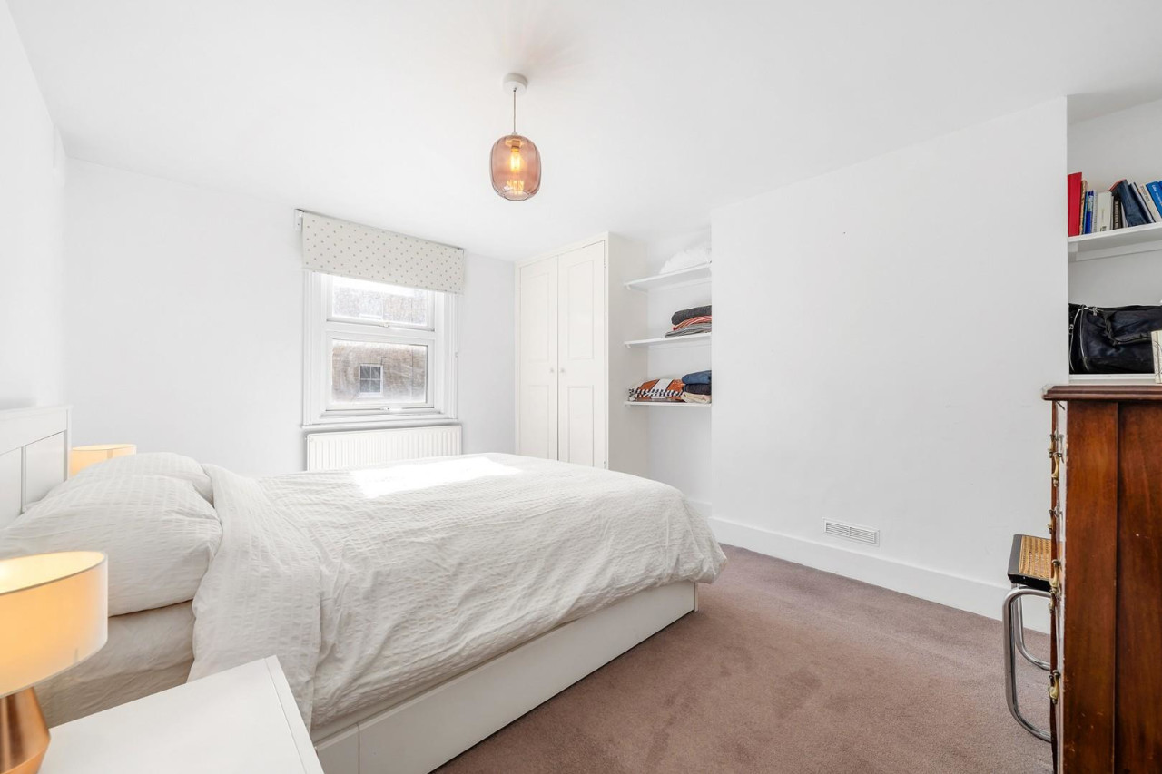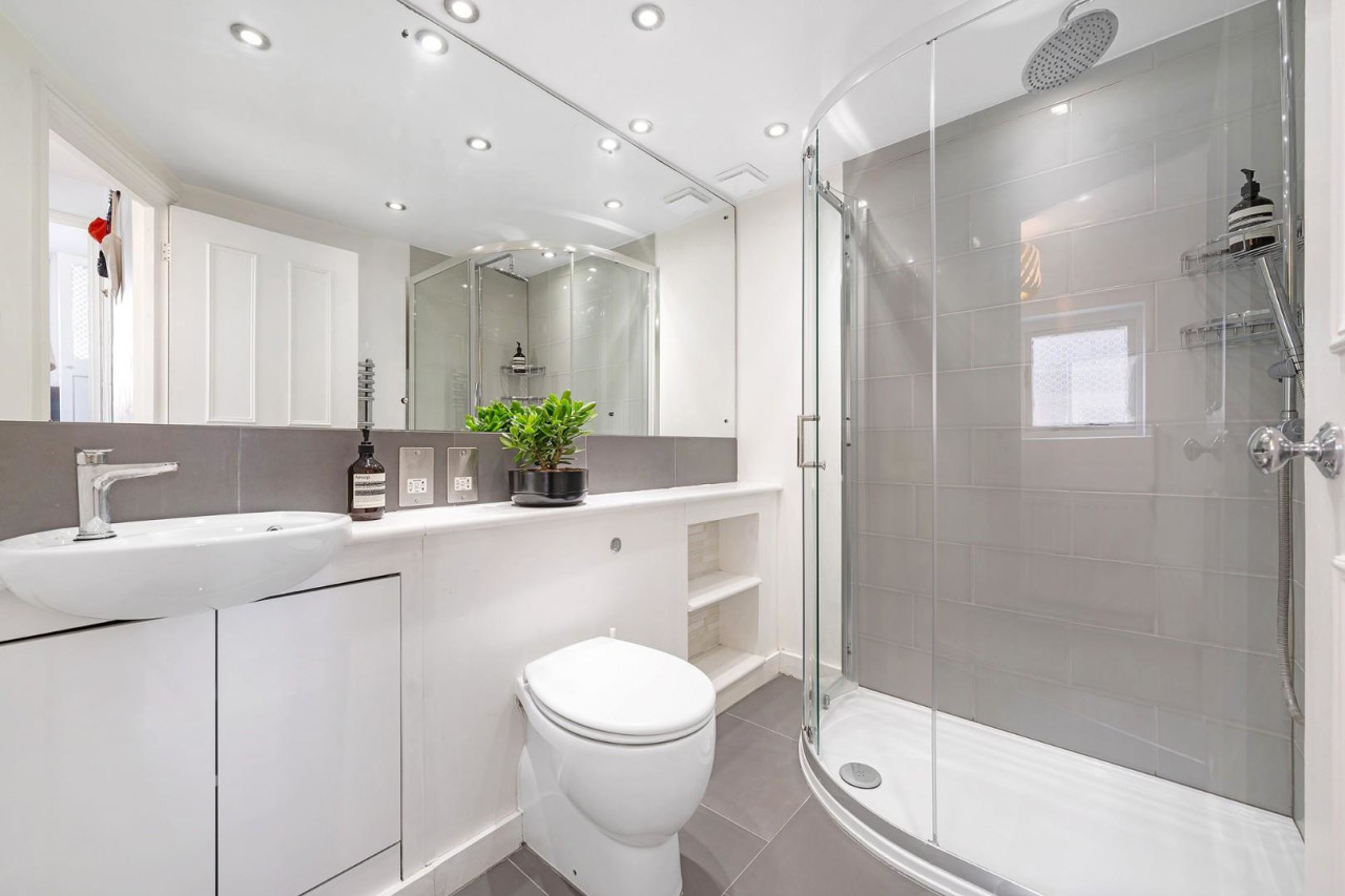 The two bedrooms are thoughtfully separated from one another, ensuring privacy and peace, and both are tucked away at the rear of the home overlooking leafy nearby gardens. The principal bedroom is a calming retreat with soft carpets, a neutral finish and fitted wardrobes. The second bedroom, still generous enough to accommodate a double bed, is currently utilised as a home office, adding versatility for modern living. Conveniently set between the bedrooms, the bathroom is tastefully presented in soothing neutral tones, finished with soft grey tiling, a luxurious rain shower, large mirror, and fitted storage to maintain a clutter-free feel.