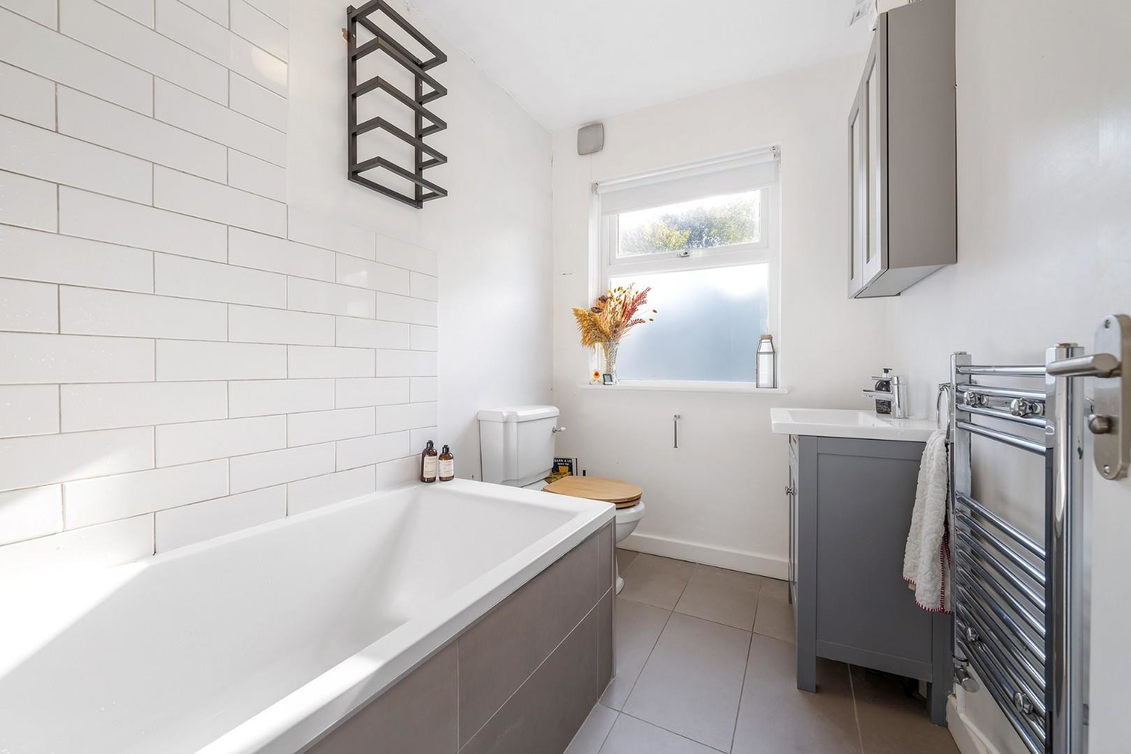 The bathroom has been finished in a modern style, with a mixture of grey tiling and crisp white subway tiles. A shower over the bath offers the convenience of both quick showers and long soaks, while a sleek grey vanity unit with integrated sink provides storage and a clean, contemporary finish. A frosted glass window allows for ventilation while ensuring privacy, and a heated towel rail adds a touch of luxury.