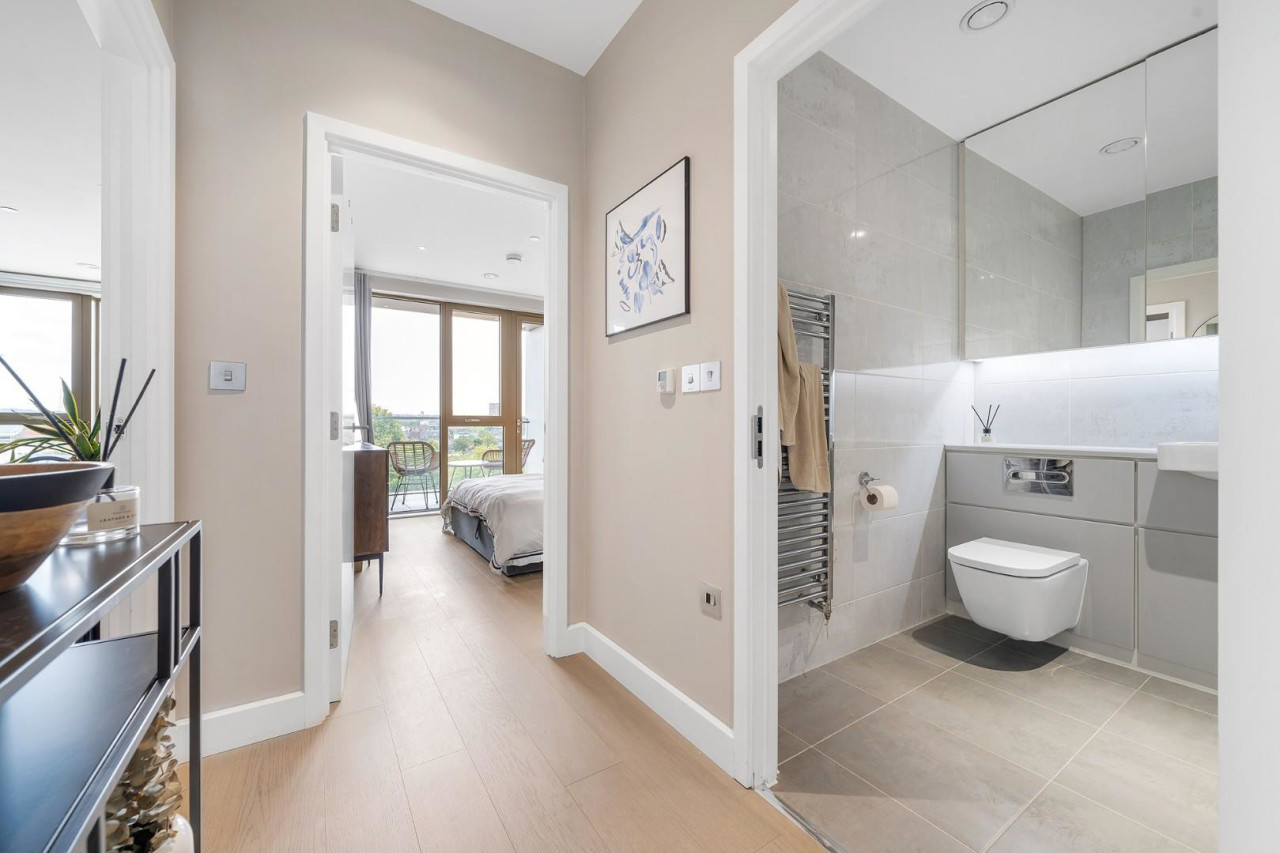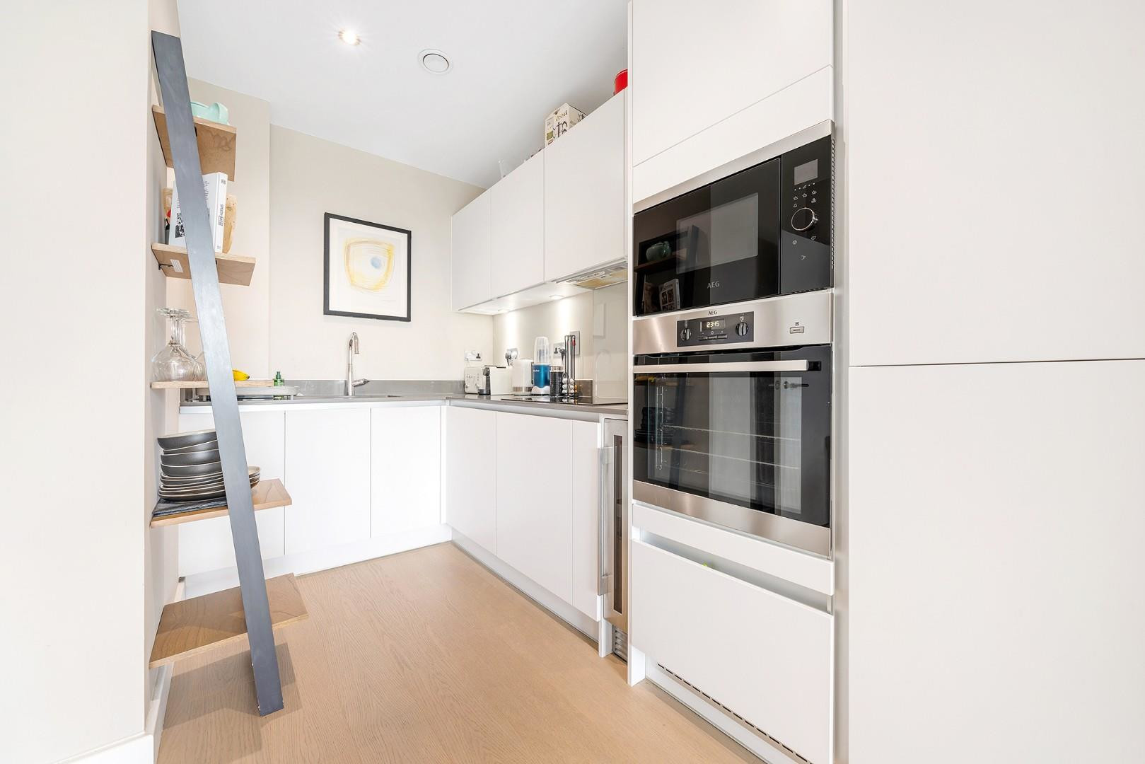 Setting it apart from others within the building, this lovely home had real wood flooring installed two year ago, creating a warming and inviting ambience. The heart of the home is the spacious open-plan reception, flooded with natural light from expansive, high-quality glazed windows. With no other tall buildings in the immediate vicinity, the property enjoys an uninterrupted outlook, with the spacious private terrace offering an ideal spot to soak in the views come day or night. This inviting living area provides ample space for a lounge and dining setup, while the stylish kitchen features sleek white cabinetry integrated appliances—including a microwave, dishwasher, and wine cooler—delivering both practicality and a contemporary aesthetic. A handy utility cupboard in the hallway liberates space in the kitchen whilst keeping the laundry tucked neatly away and providing additional storage.
