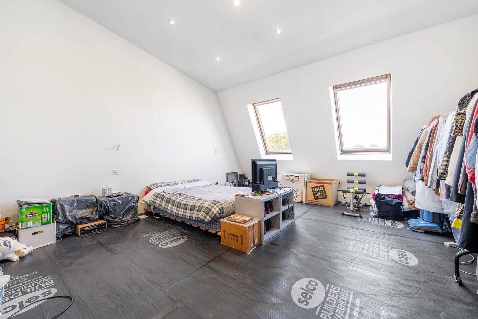 The vast heart of the home is the showstopping open-plan reception kitchen, spanning over eleven metres in length. This cavernous space is designed for both entertaining and everyday family life, enhanced by soaring ceilings and almost a full wall of glass flooding the room with natural light. Engineered wooden flooring flows seamlessly from the kitchen into the living area, creating a warm yet contemporary atmosphere. The sleek, glossy kitchen cabinetry is arranged down both sides, while a stylish island with breakfast bar takes centre stage, perfect for casual dining or social gatherings. A striking gold mirrored splashback adds a touch of luxury, and a large walk-in pantry provides ample additional storage. The living space is a delight, bathed in sunlight from two elevated windows, a floor-level picture window and wide glass doors which open directly onto the garden.